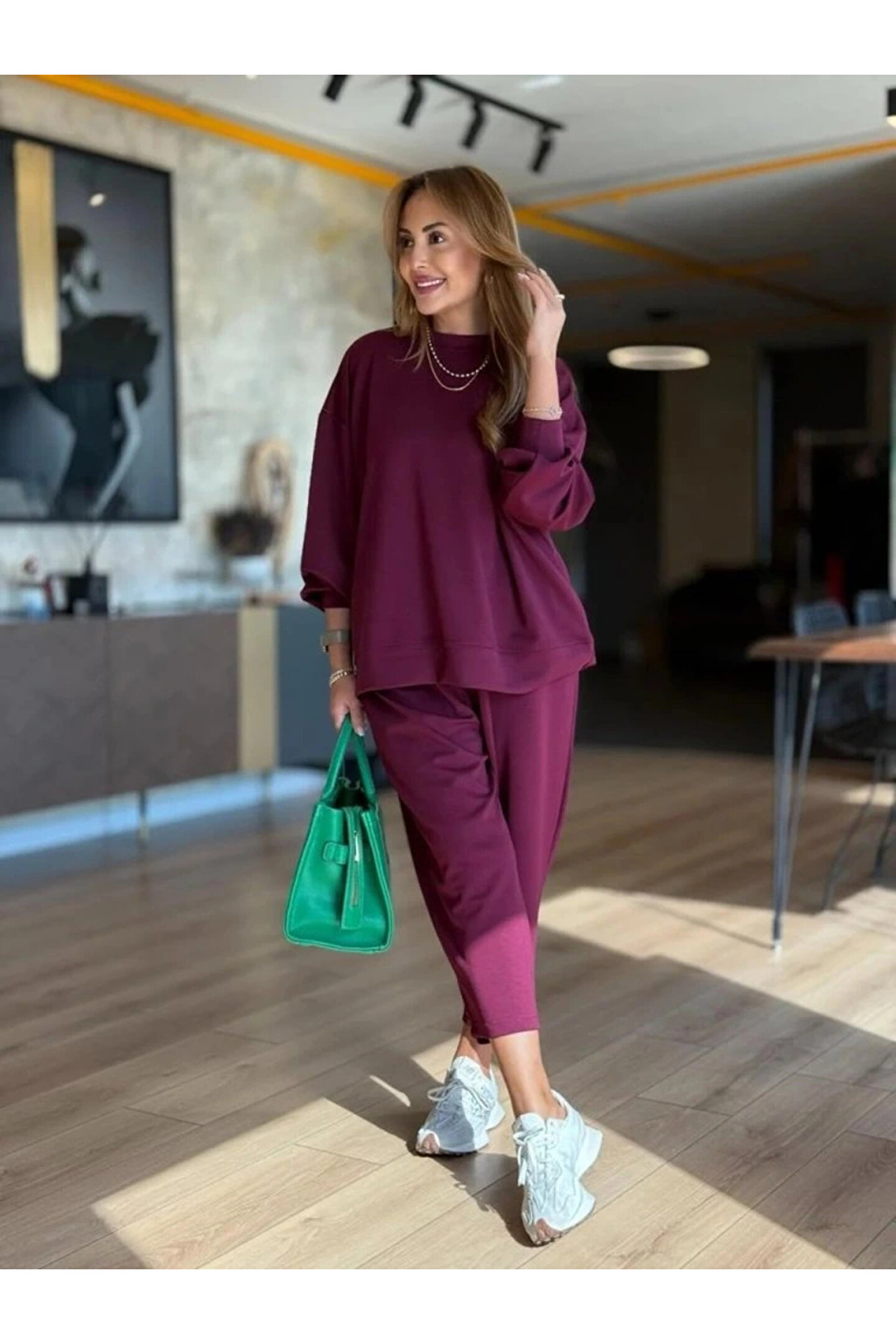 Kadın Uzun Kollu Bisiklet Yaka Viskon Iki Iplik Mor Bluz Ve Pantolon Ikili Takım