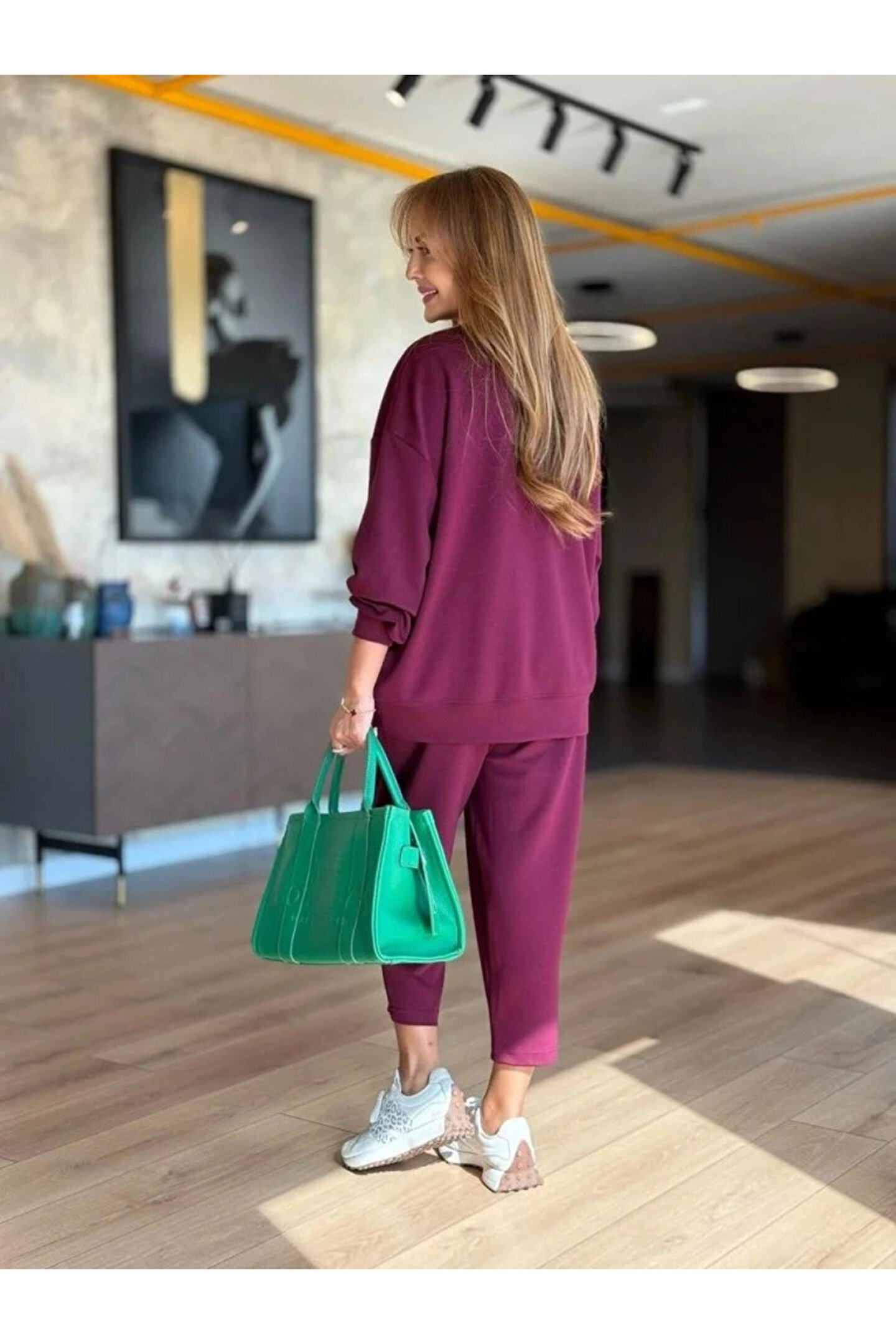 Butik Kadın Uzun Kollu Bisiklet Yaka Viskon Iki Iplik Mor Bluz Ve Pantolon Ikili Takım