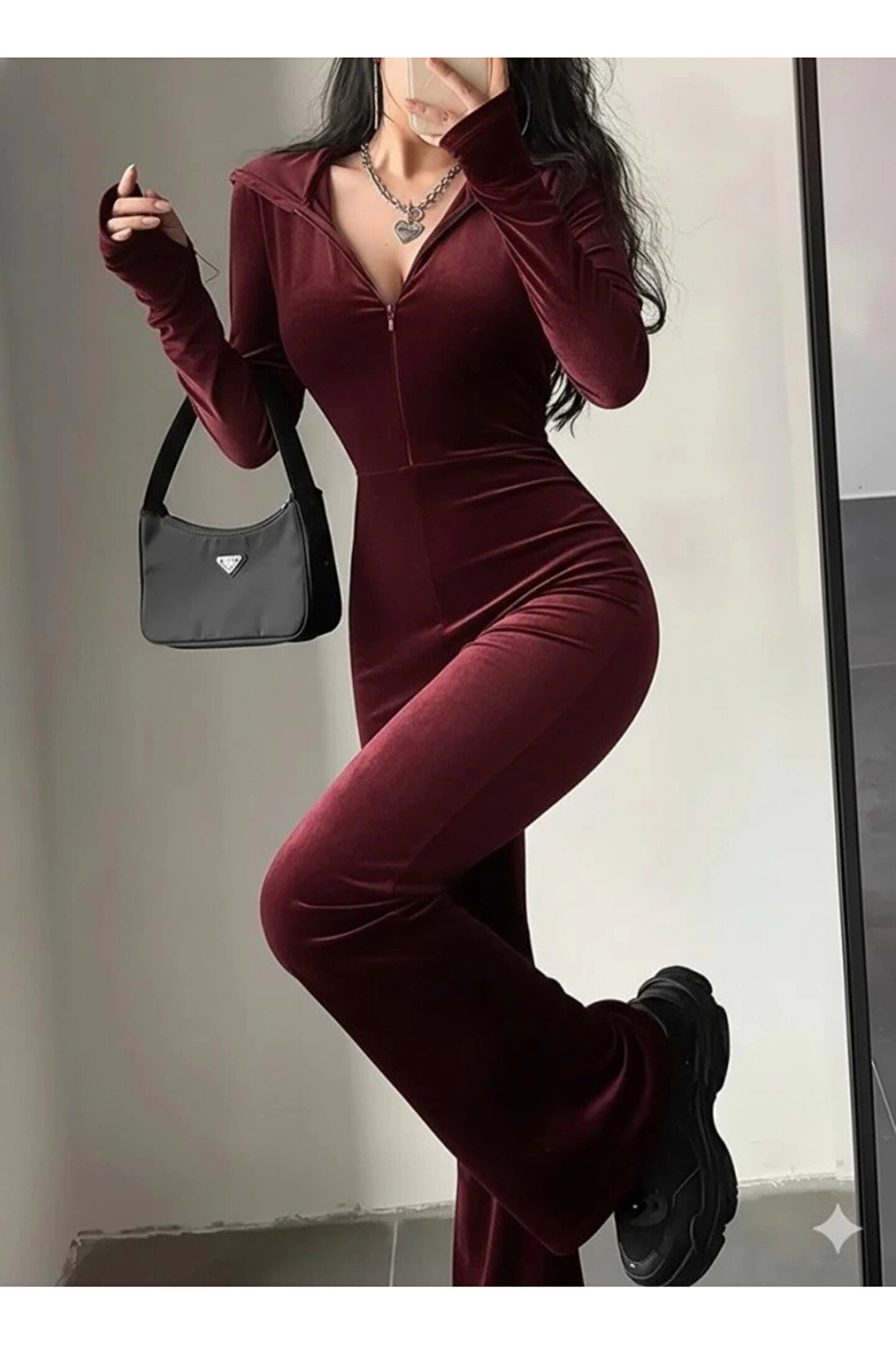 Butik Kadın Uzun Kollu Kapşonlu Fermuarlı Kadife Tulum