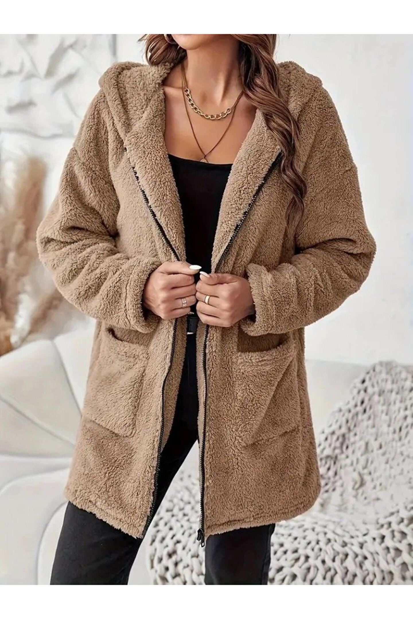 Butik Kadın Uzun Kollu Kapşonlu önden Fermuarlı Cepli Welsoft Ceket