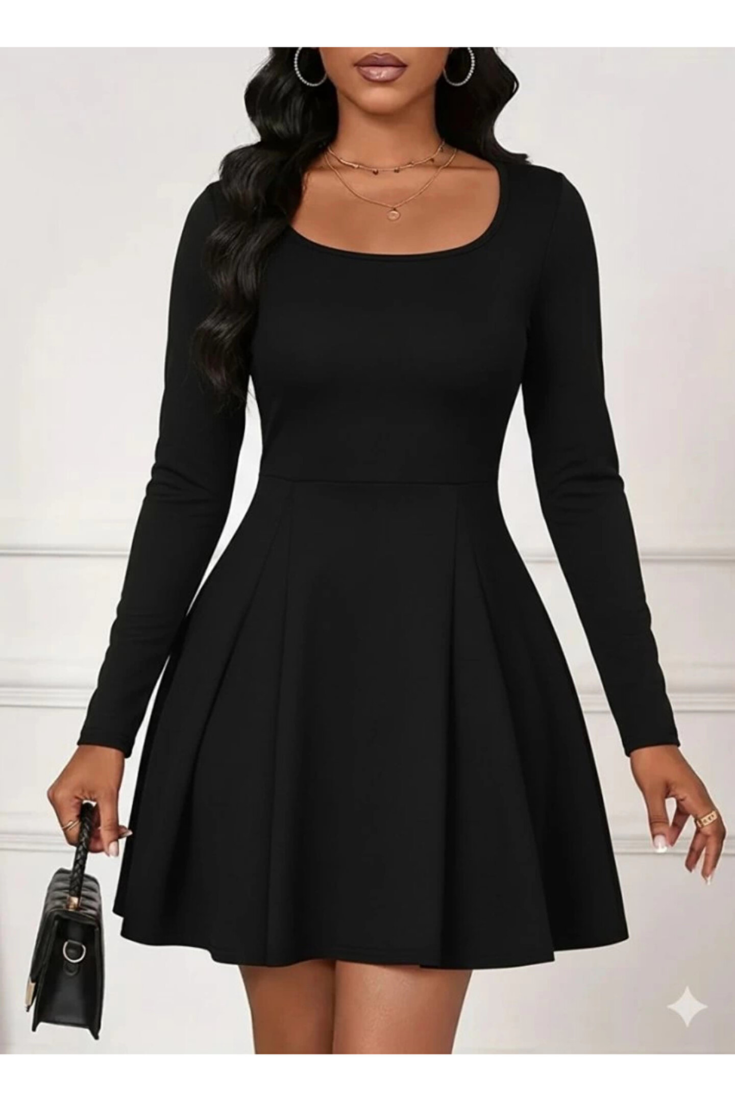 Kadın Uzun Kollu Kare Yakalı Mini Ithal Krep Elbise