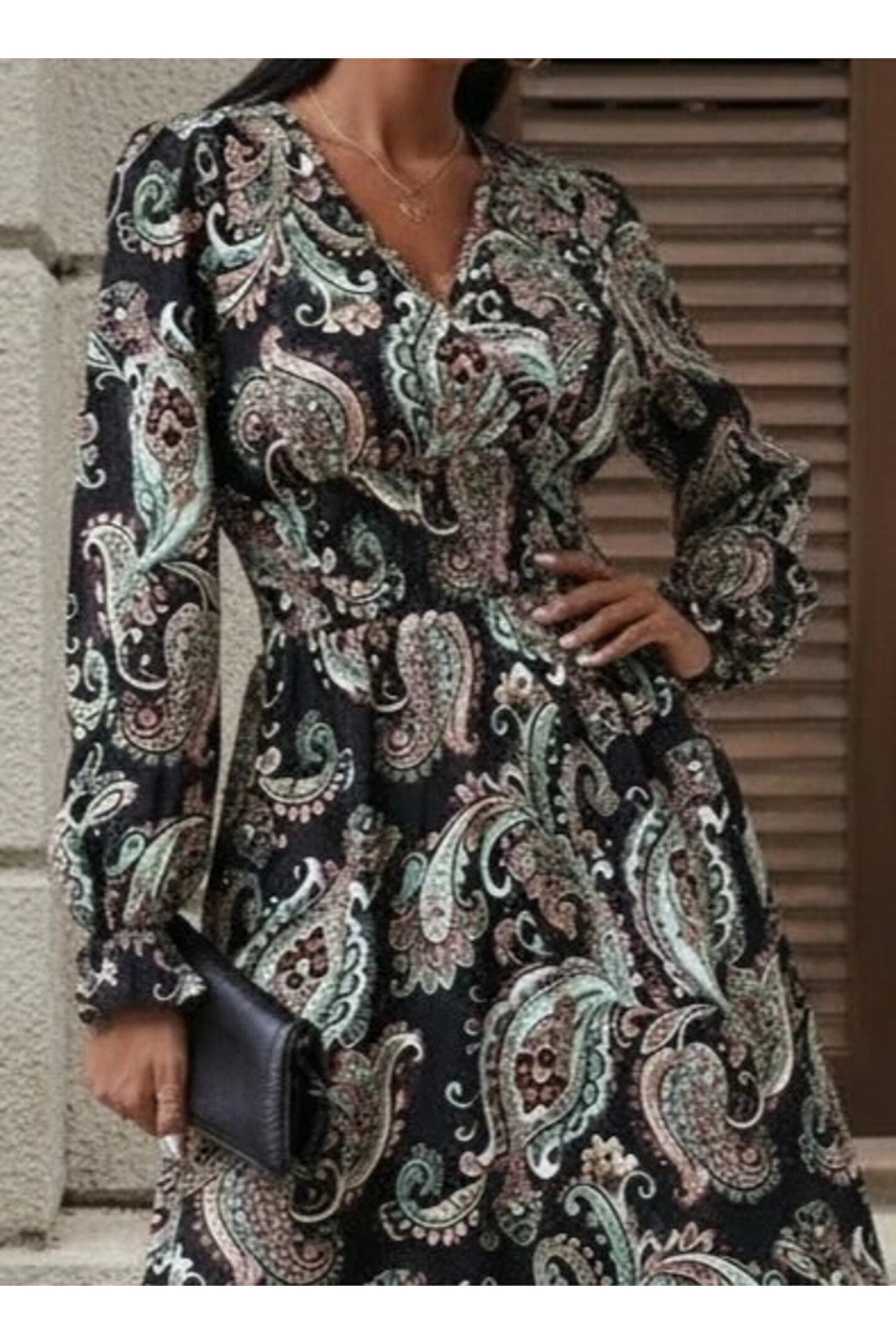 Butik Kadın Uzun Kollu Kruvaze Yaka Beli Lastikli Uzun Desenli Maxi Elbise