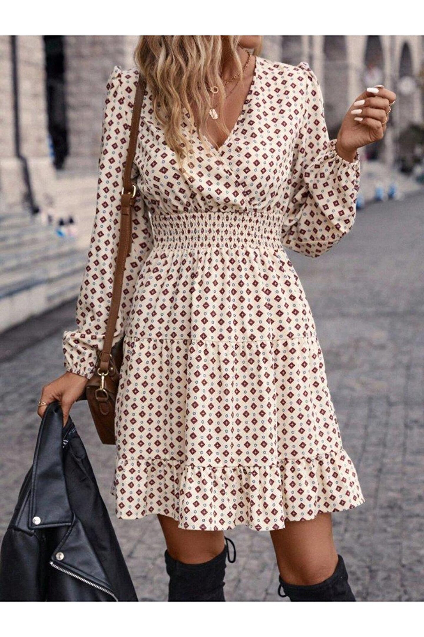 Kadın Uzun Kollu Kruvaze Yaka Desenli Mini Modal Elbise