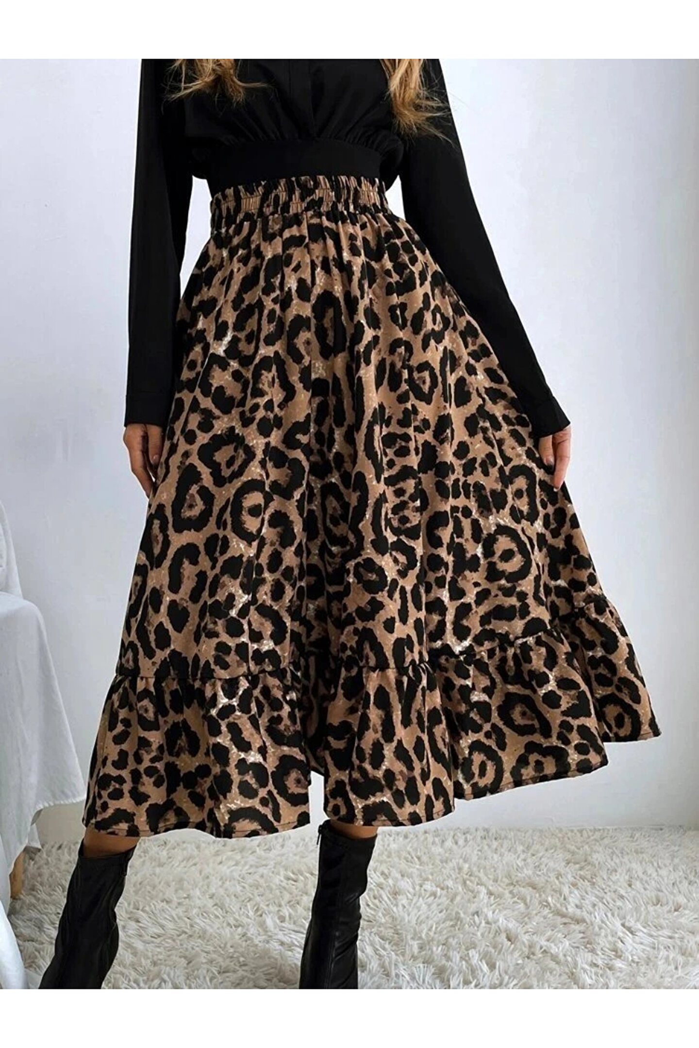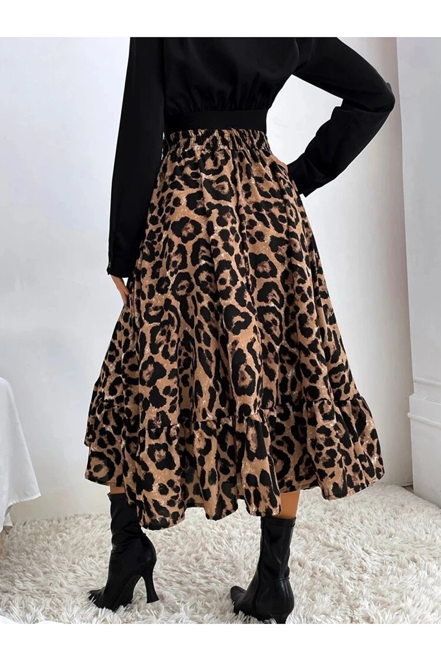 Butik Kadın Uzun Kollu Kruvaze Yakalı Ithal Krep Bluz Ve Leopar Desenli Süprem Uzun Elbise