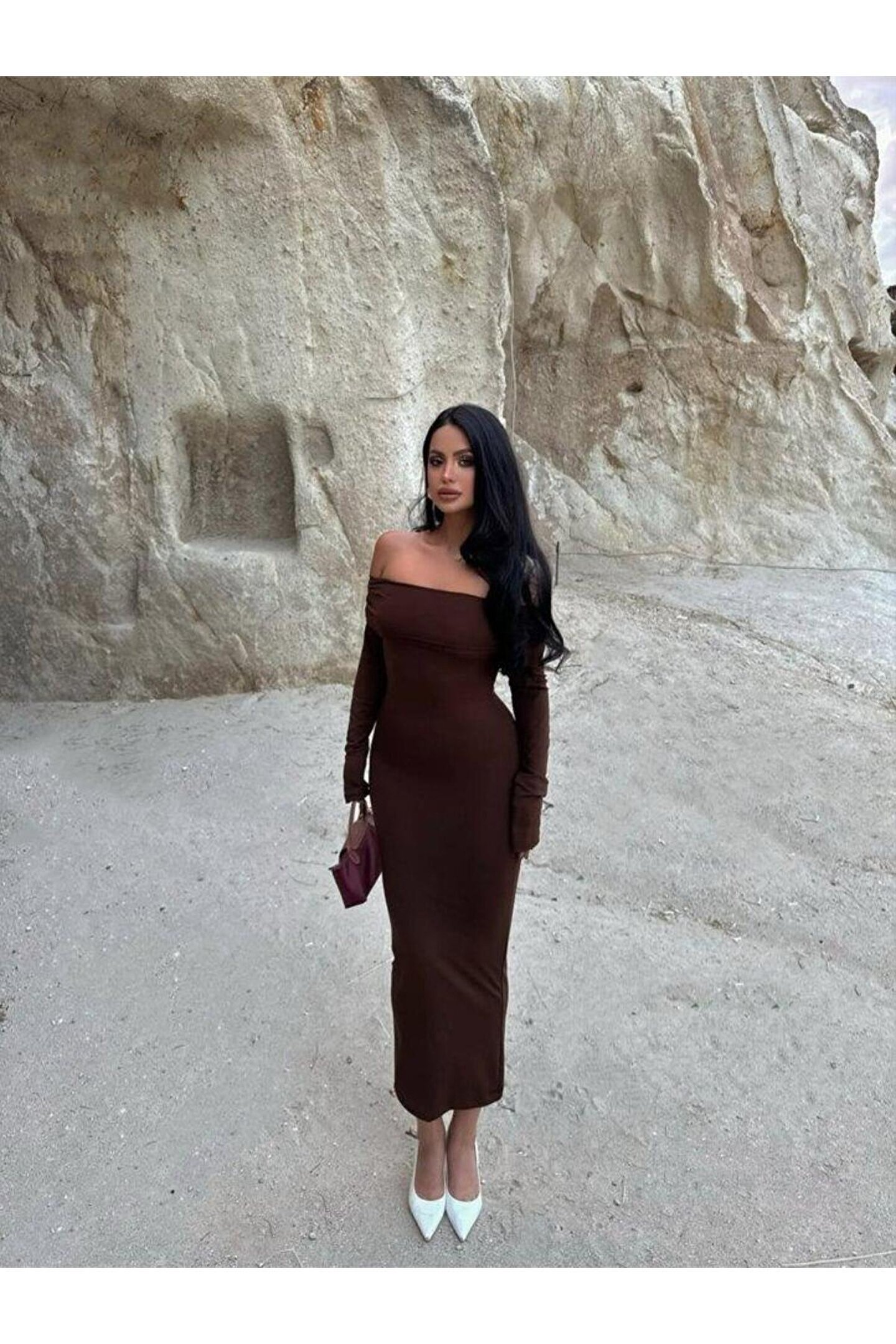 Kadın Uzun Kollu Madonna Yaka Midi Boy Elbise