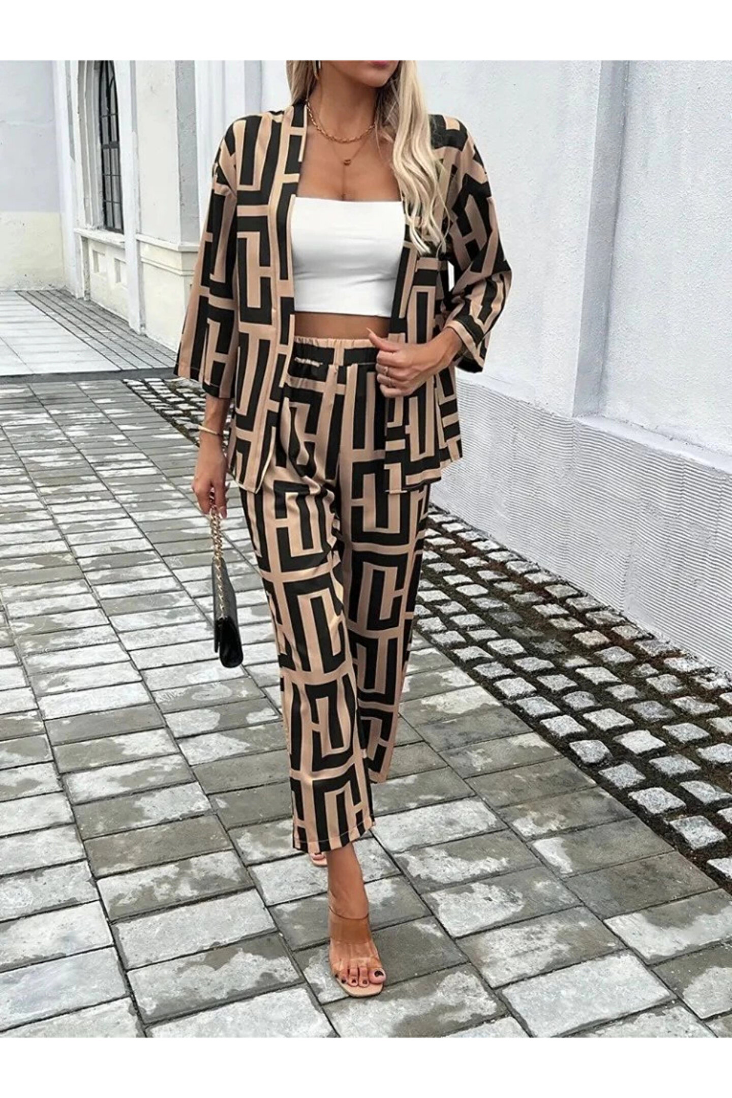 Butik Kadın Uzun Kollu önü Açık Desenli Iki Iplik Ceket Ve Pantolon Ikili Takım