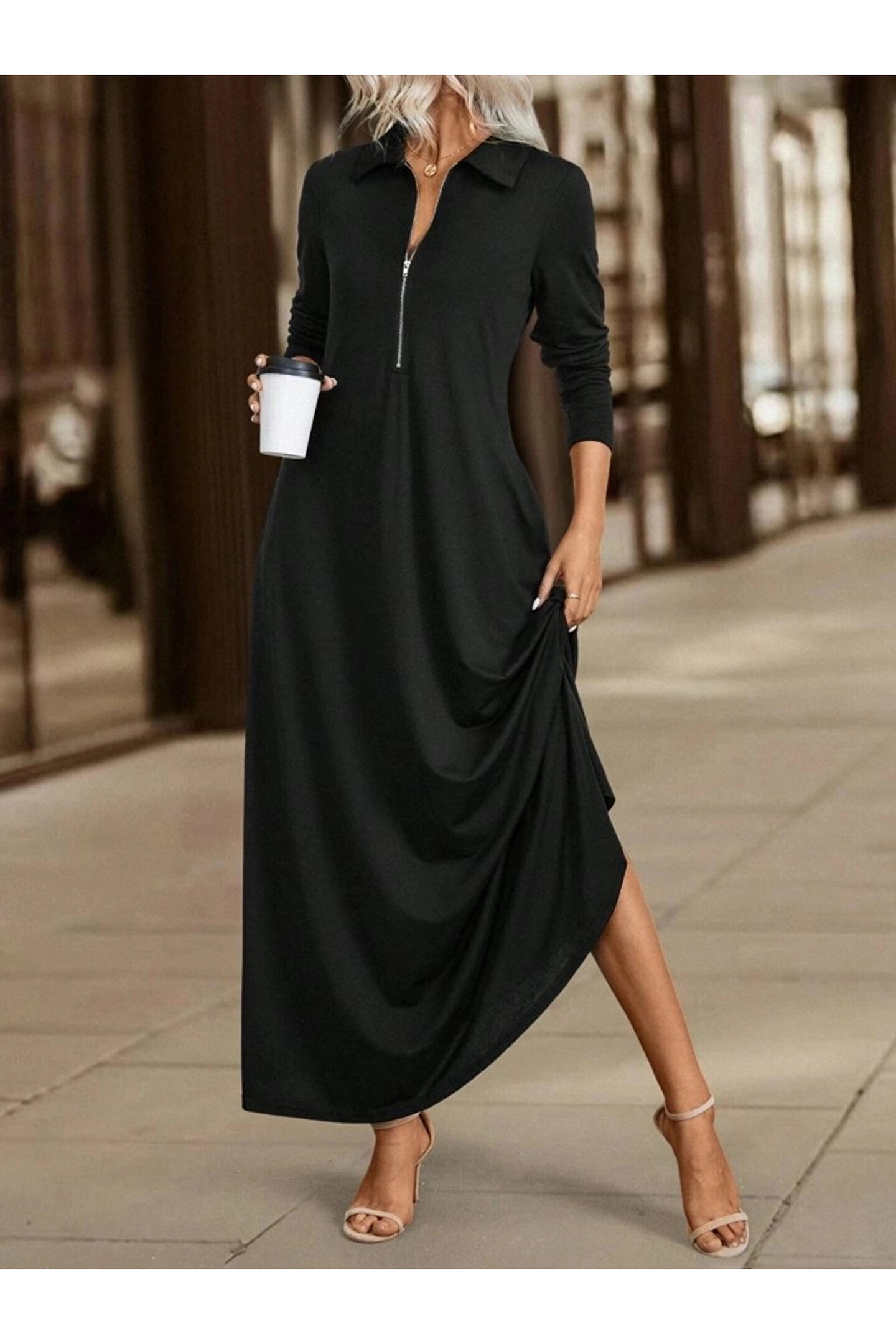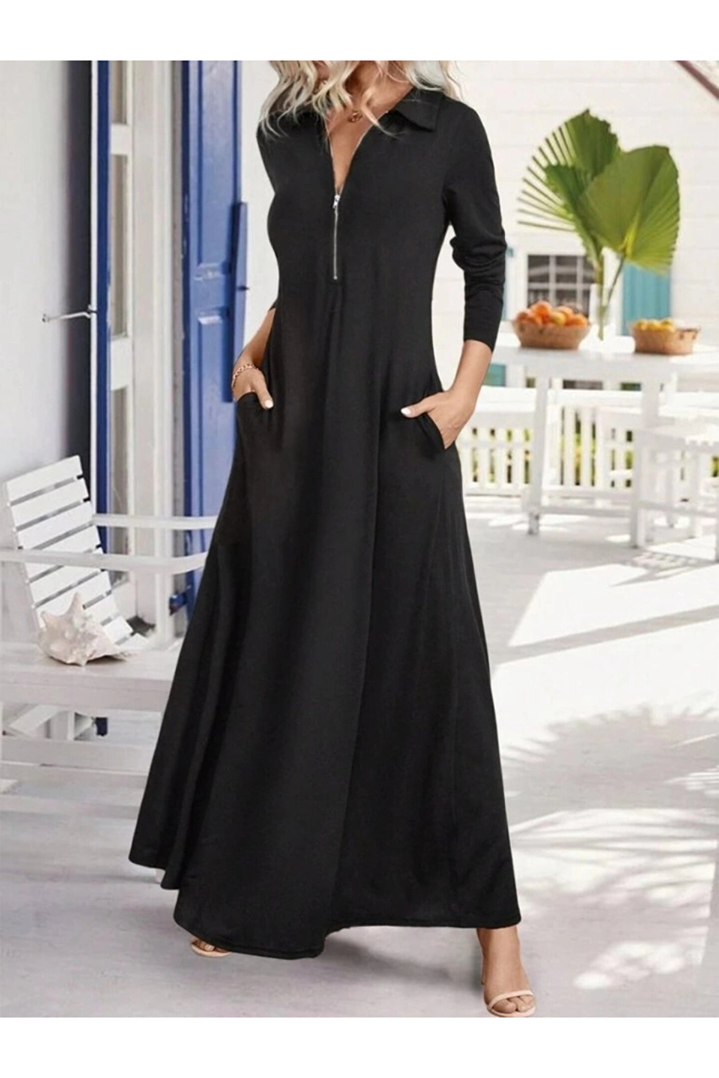 Kadın Uzun Kollu Yakalı önden Fermuarlı Uzun Viskon Iki Iplik Elbise