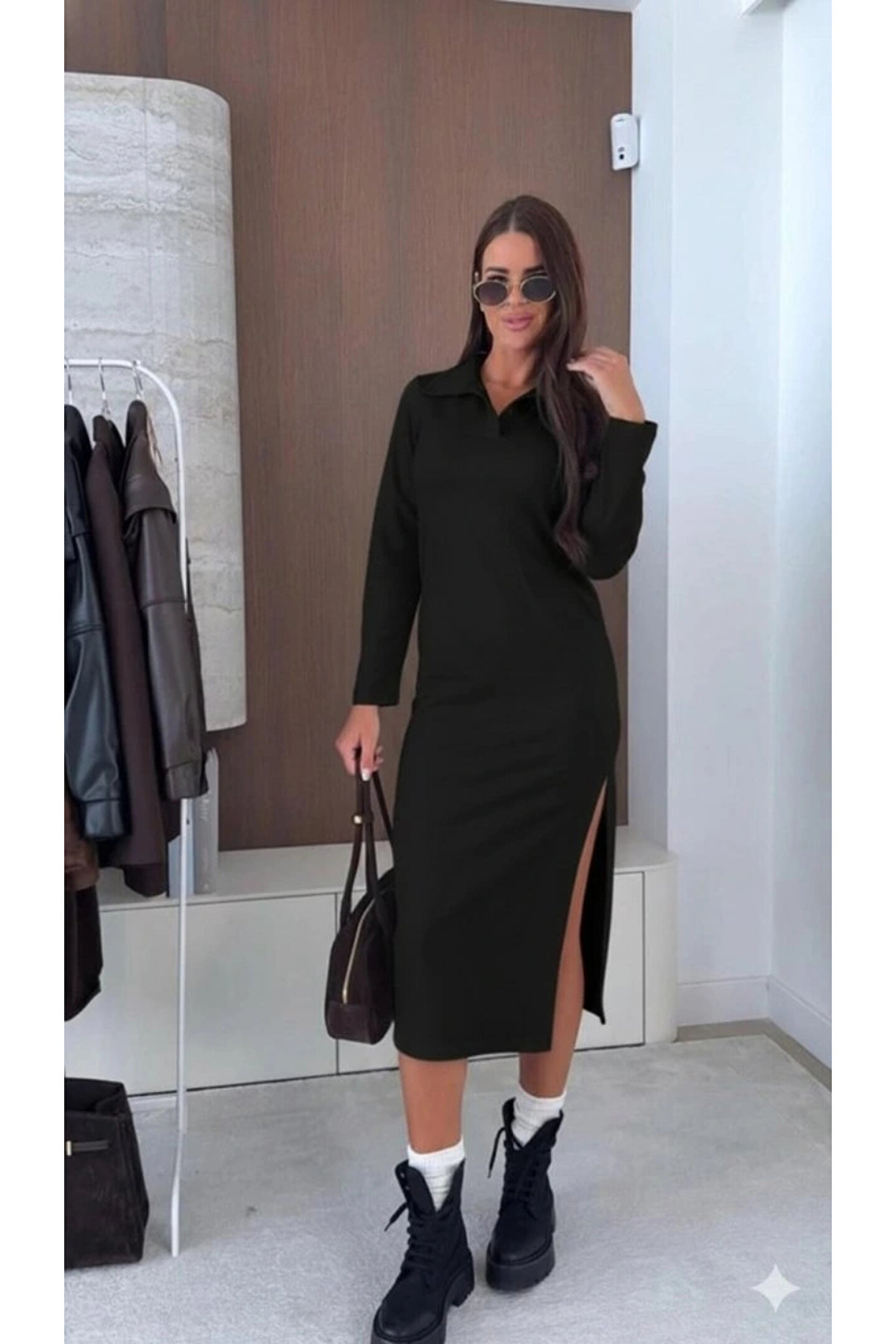 Butik Kadın Uzun Kollu Yakalı Yandan Yırtmaçlı Midi Modal Elbise