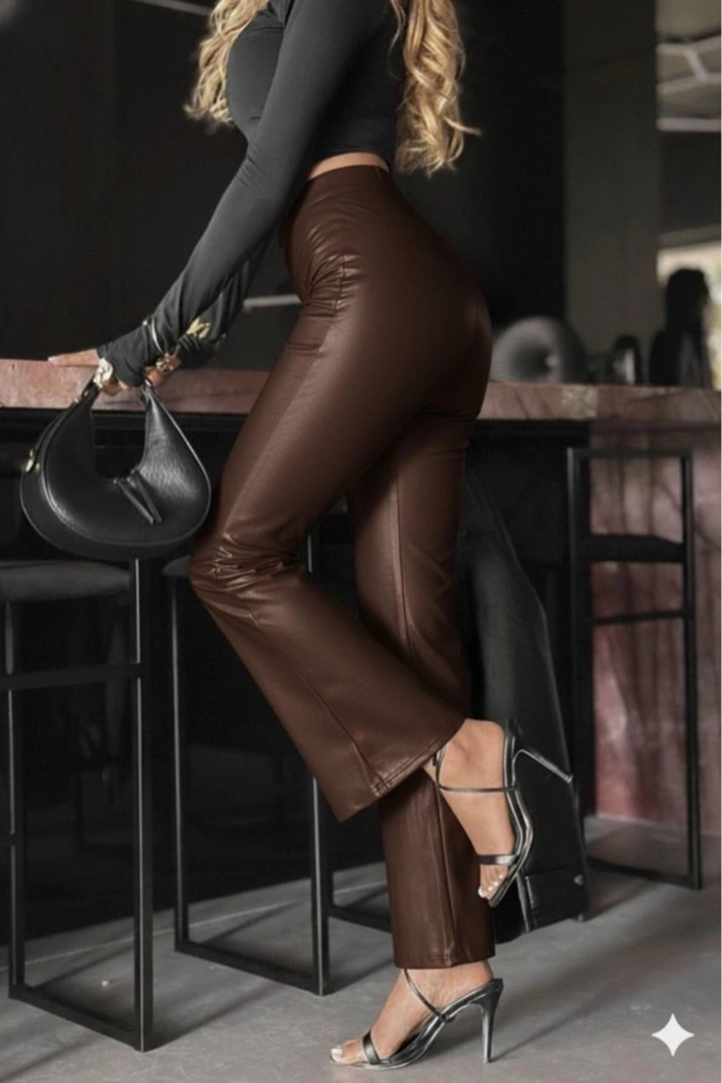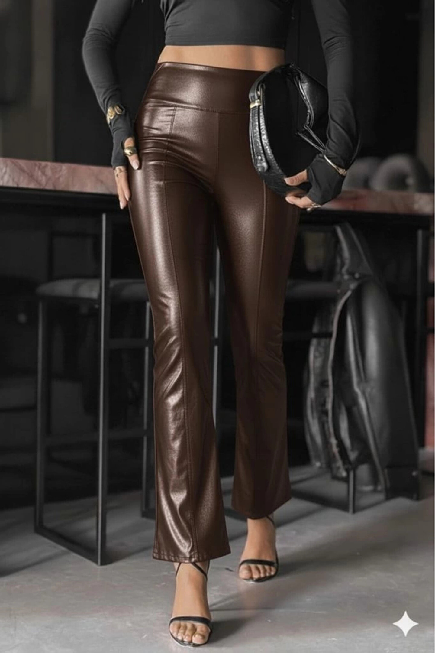 Butik Kadın Yüksek Bel Paçaya Doğru Geniş Deri Pantolon