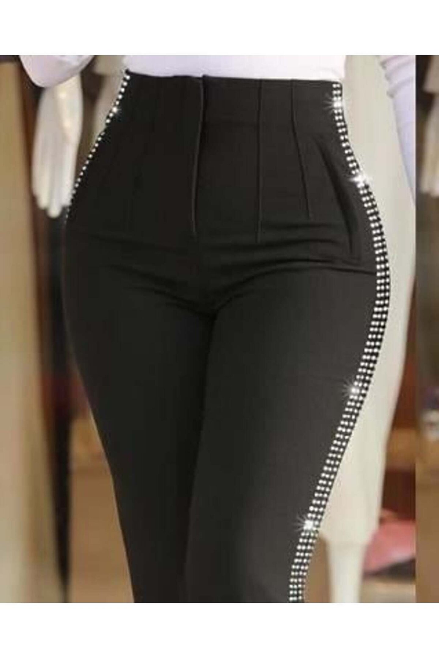 Butik Kadın Yüksek Bel Yanlardan Taş Detaylı Ithal Krep Pantolon