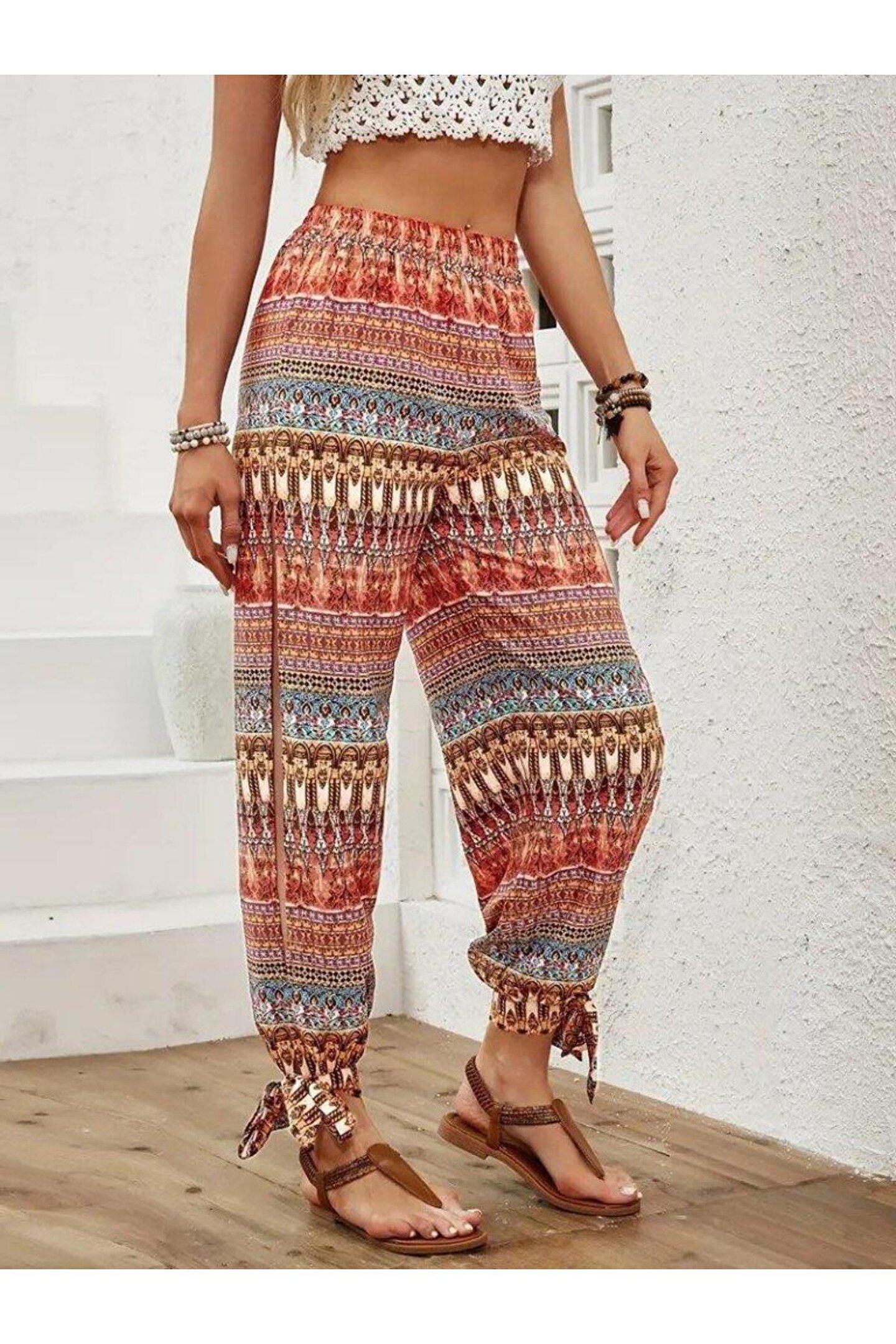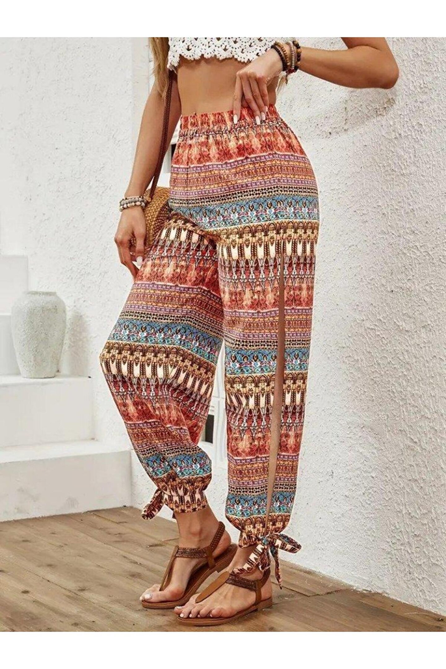 Butik Kadın Yüksek Belli Yanlardan Yırtmaç Detaylı Desenli Bürümcük Pantolon