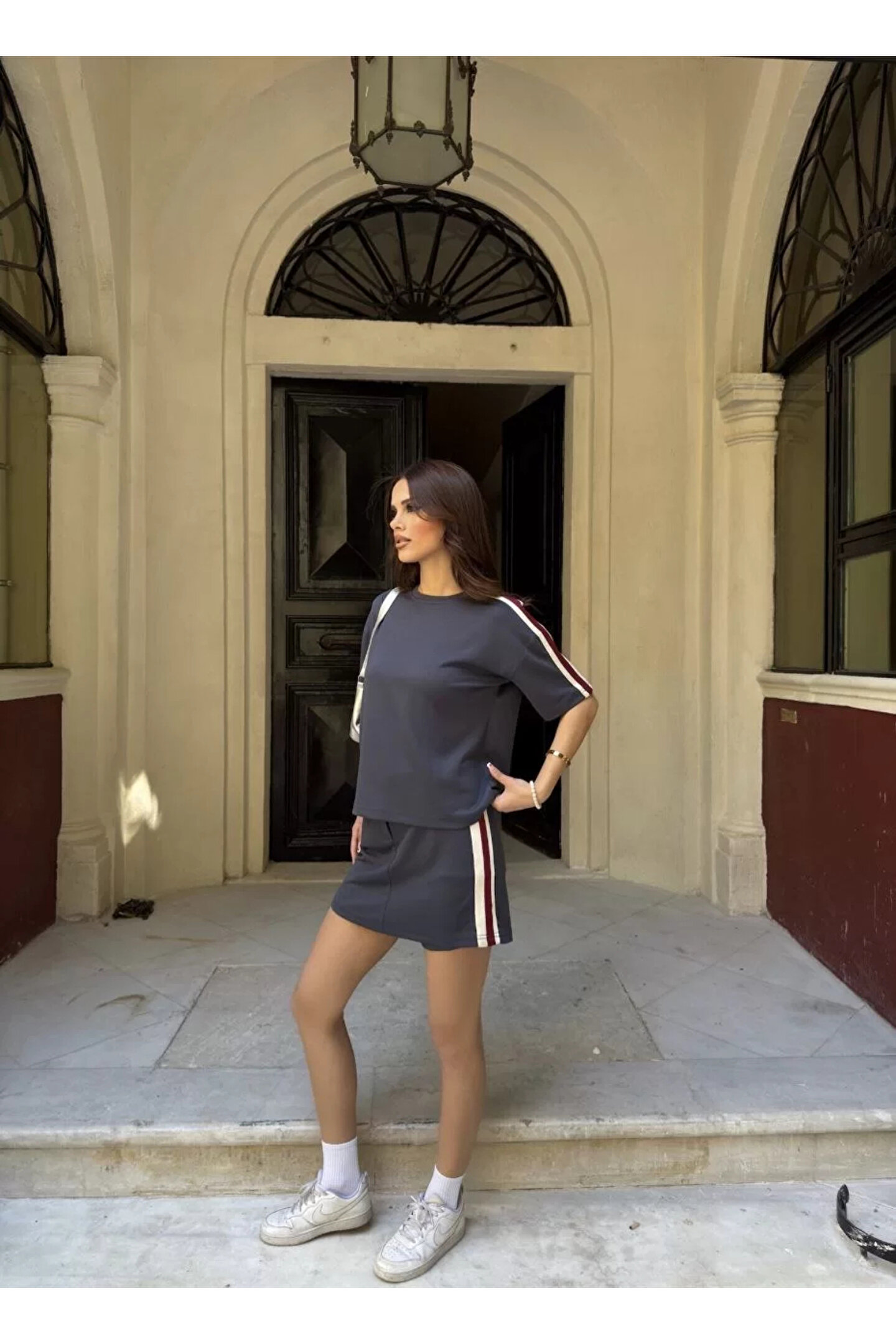 Osy Modal Yumuşak Dokulu Kumaş Parçalı Bisiklet Yaka T-shirt Mini Şortlu Etek İkili Takım - Füme