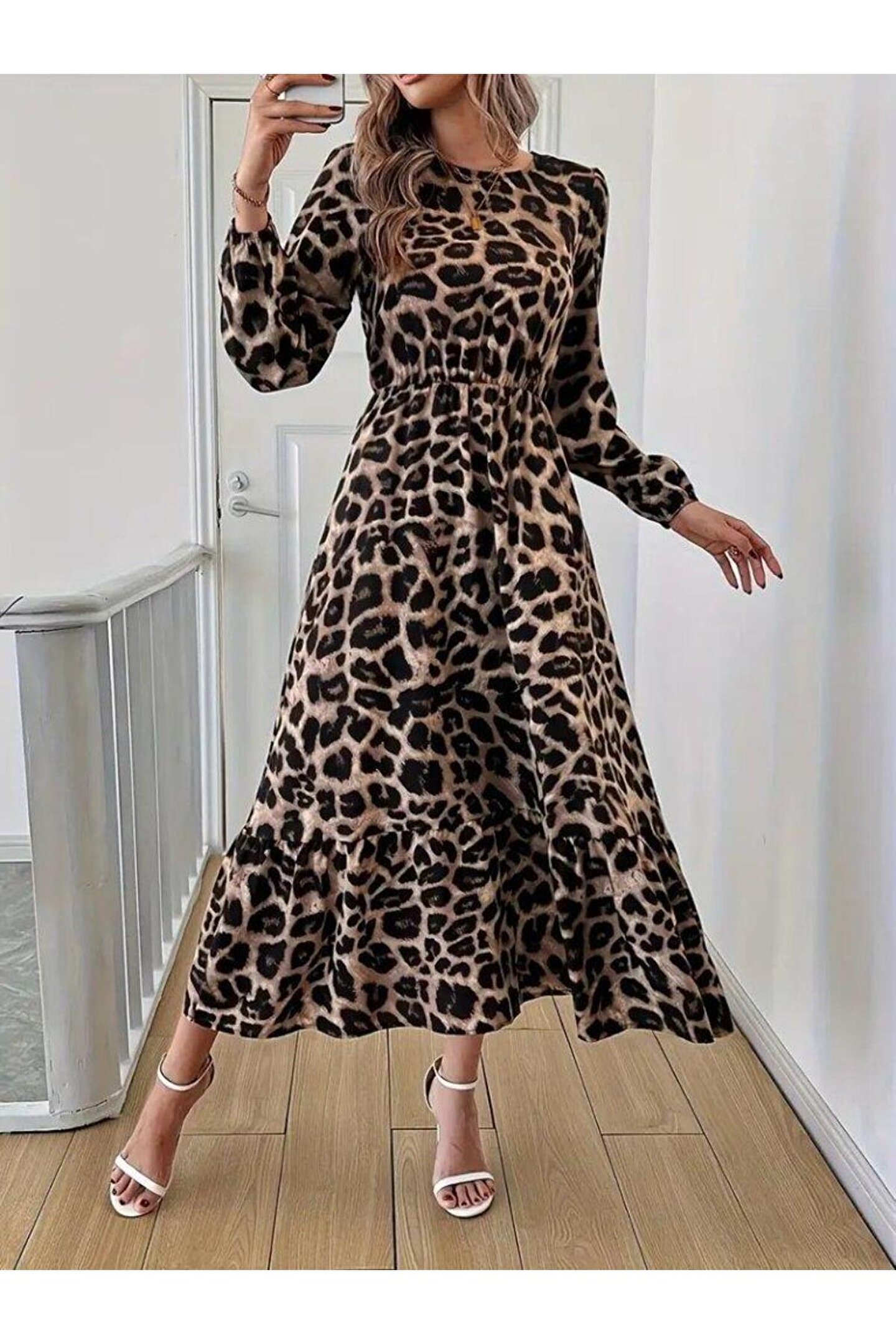 Uzun Kollu Bisiklet Yaka Leopar Desenli Midi Süprem Elbise