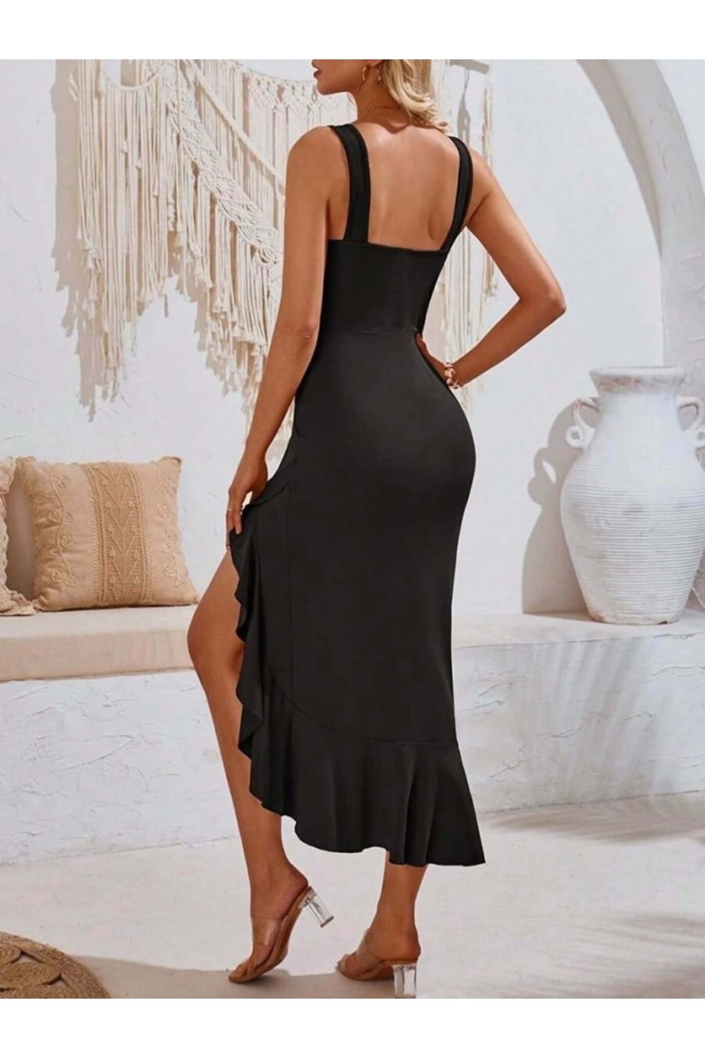 BY ELİZE Kadın Askılı V Yakalı önden Fırfırlı Uzun Dalgıç Elbise