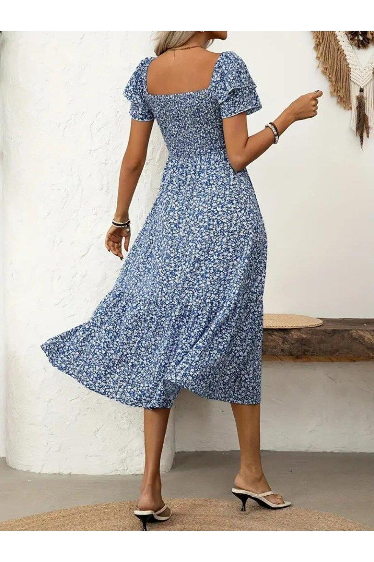 Kadın Kısa Kollu Gipe Detaylı Desenli Midi Süprem Elbise