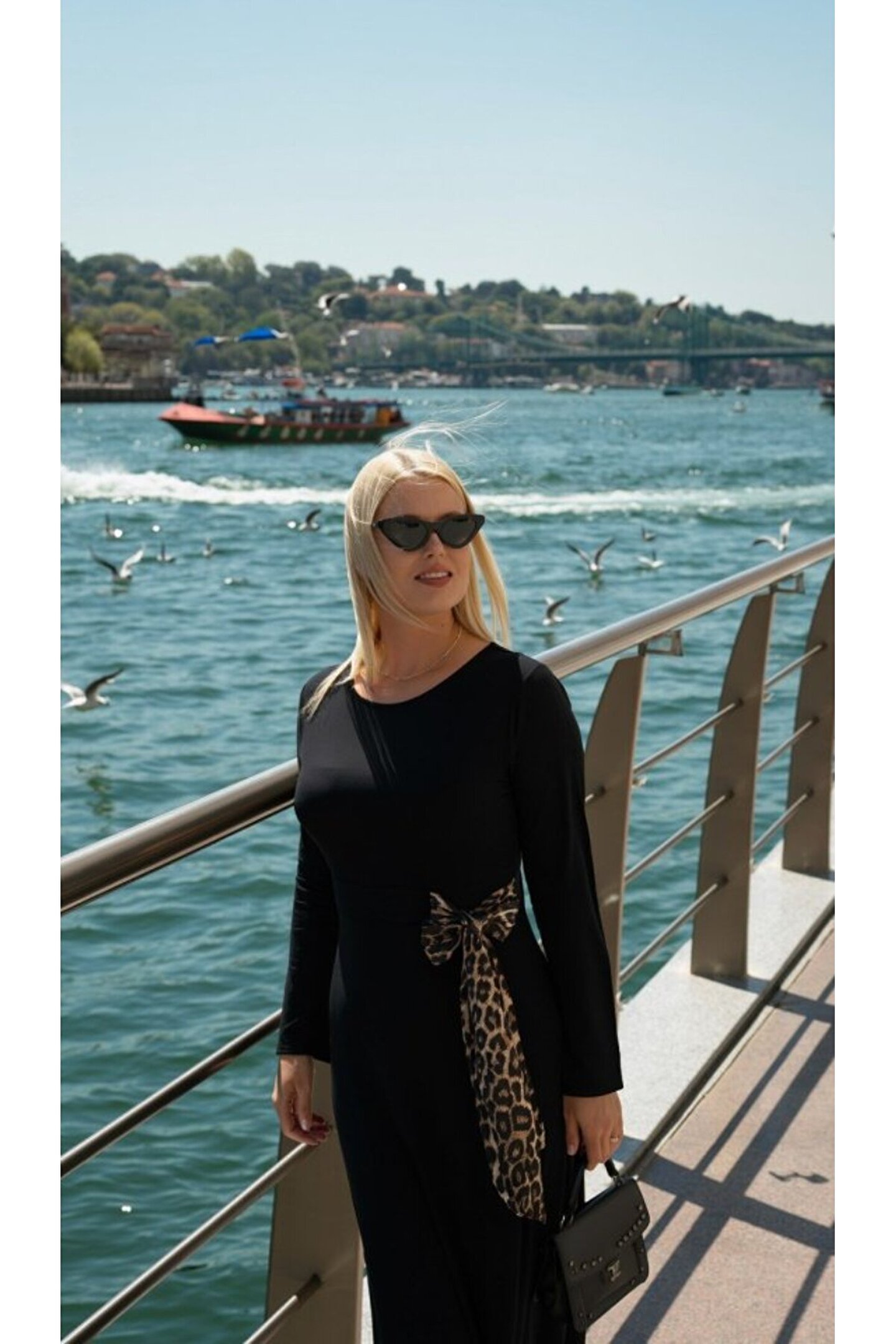 By Sevilen Collection Kadın Bisiklet Yaka Leopar Fiyonk Detay Maxi Boy Elbise