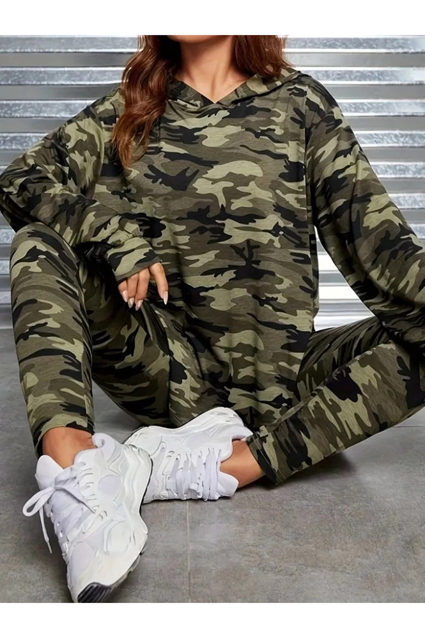 Kadın Uzun Kollu Kapşonlu Kamuflaj Desenli Bluz Ve Pantolon Tayt Ikili Takım