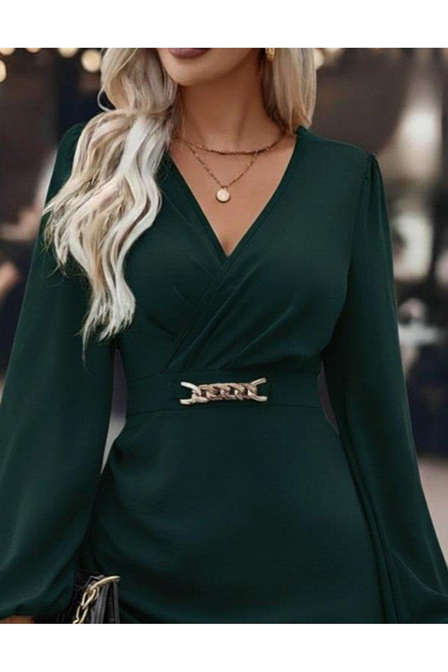 By Sevilen Collection Kadın Uzun Kollu Kruvaze Yaka Yandan Büzgülü Asimetrik Detaylı Ithal Krep Mini Elbise