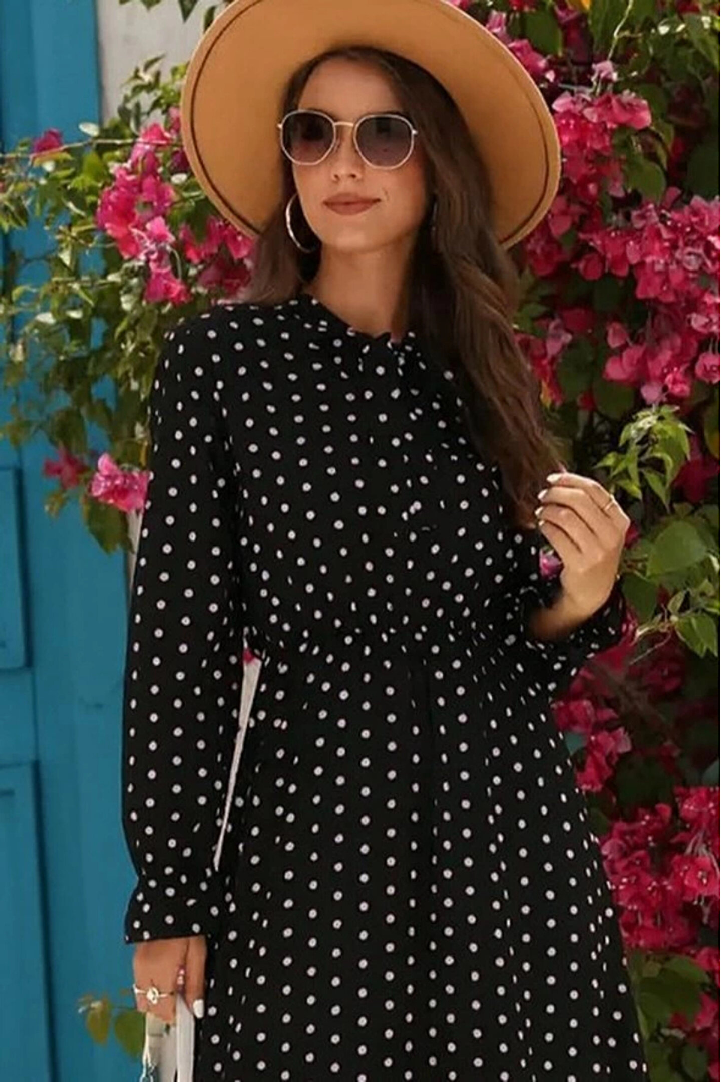 By Sevilen Collection Kadın Uzun Kollu Yakası Bağcıklı Uzun Puantiyeli Krep Maxi Elbise