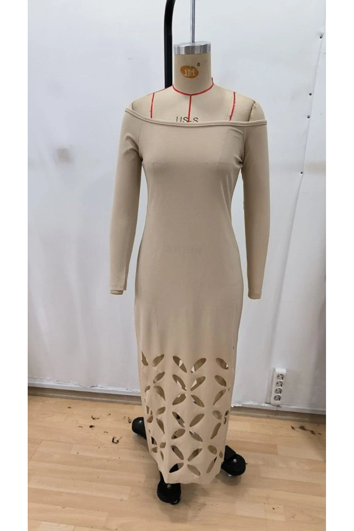 Kadın Madonna Yaka Uzun Kollu Lazer çiçek Kesim Detaylı Uzun Ithal Krep Elbise