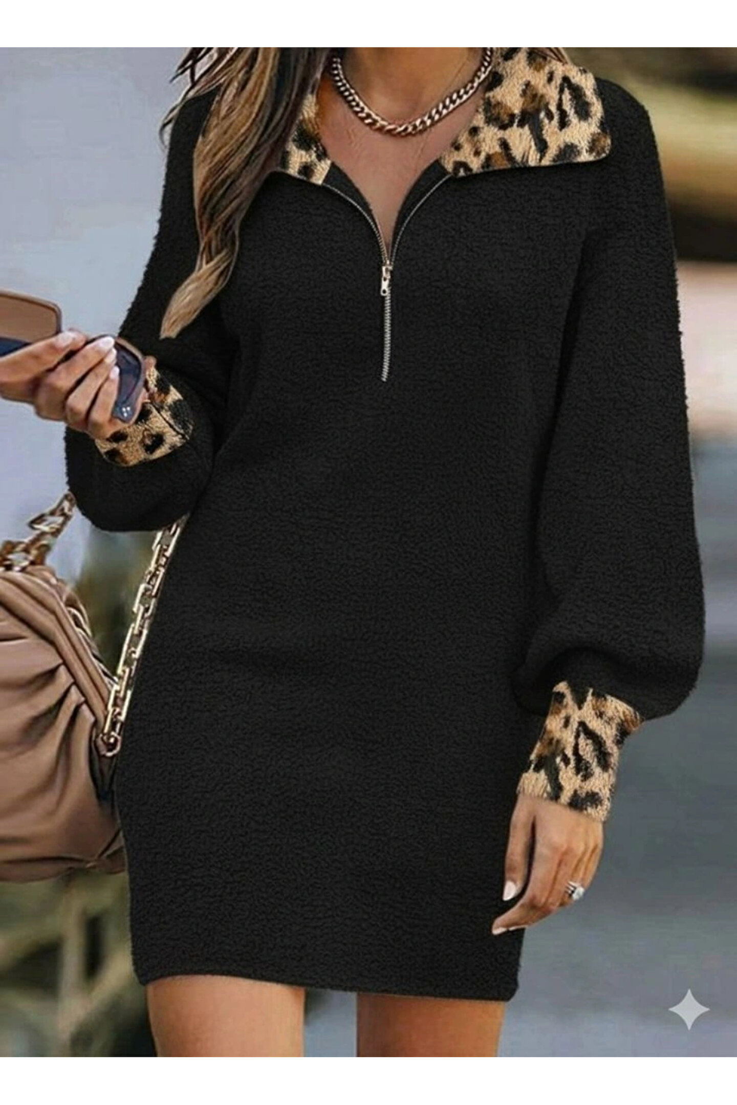 MDB Kadın Uzun Kollu Yakalı önden Fermuarlı Leopar Detaylı Mini Peluş Elbise
