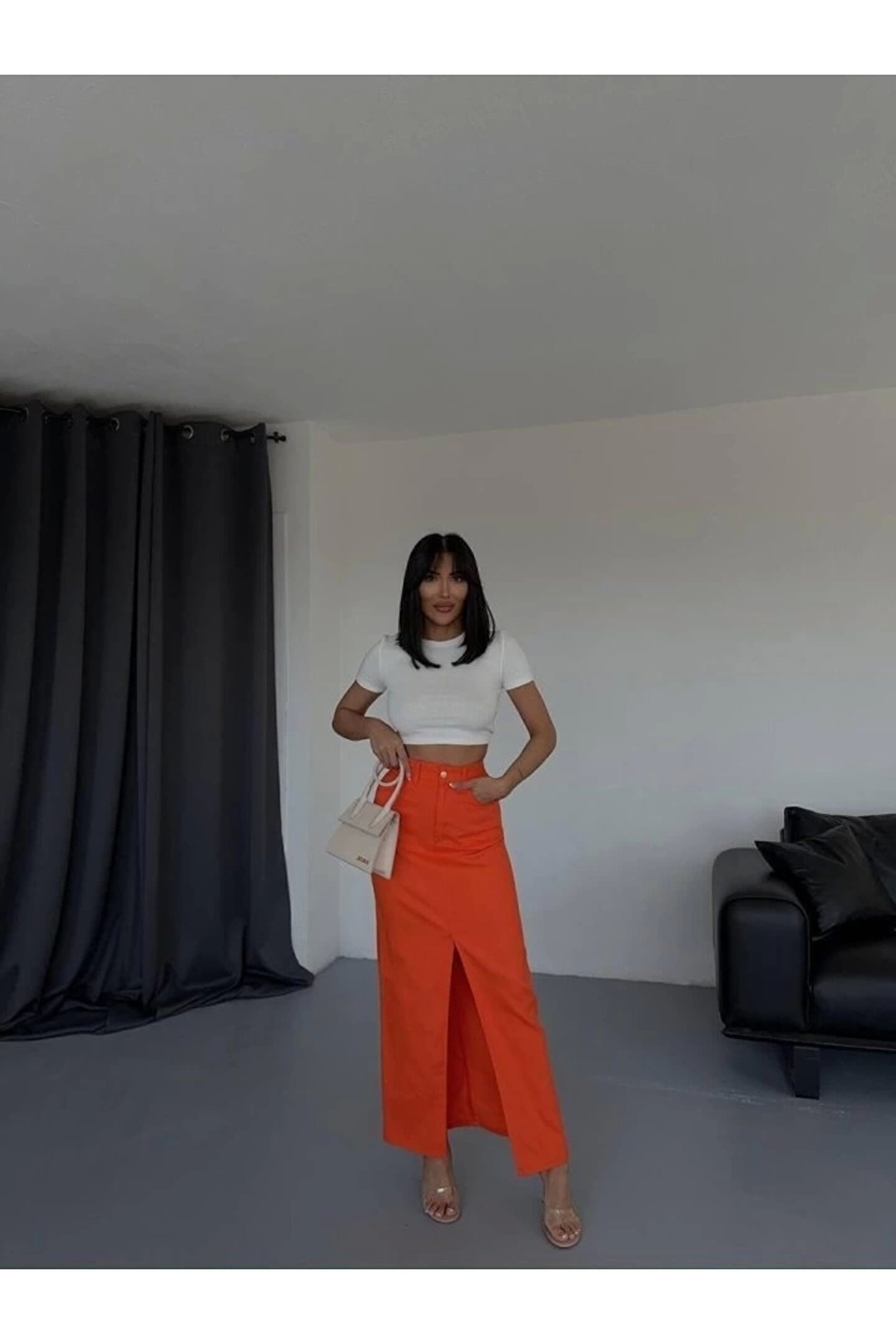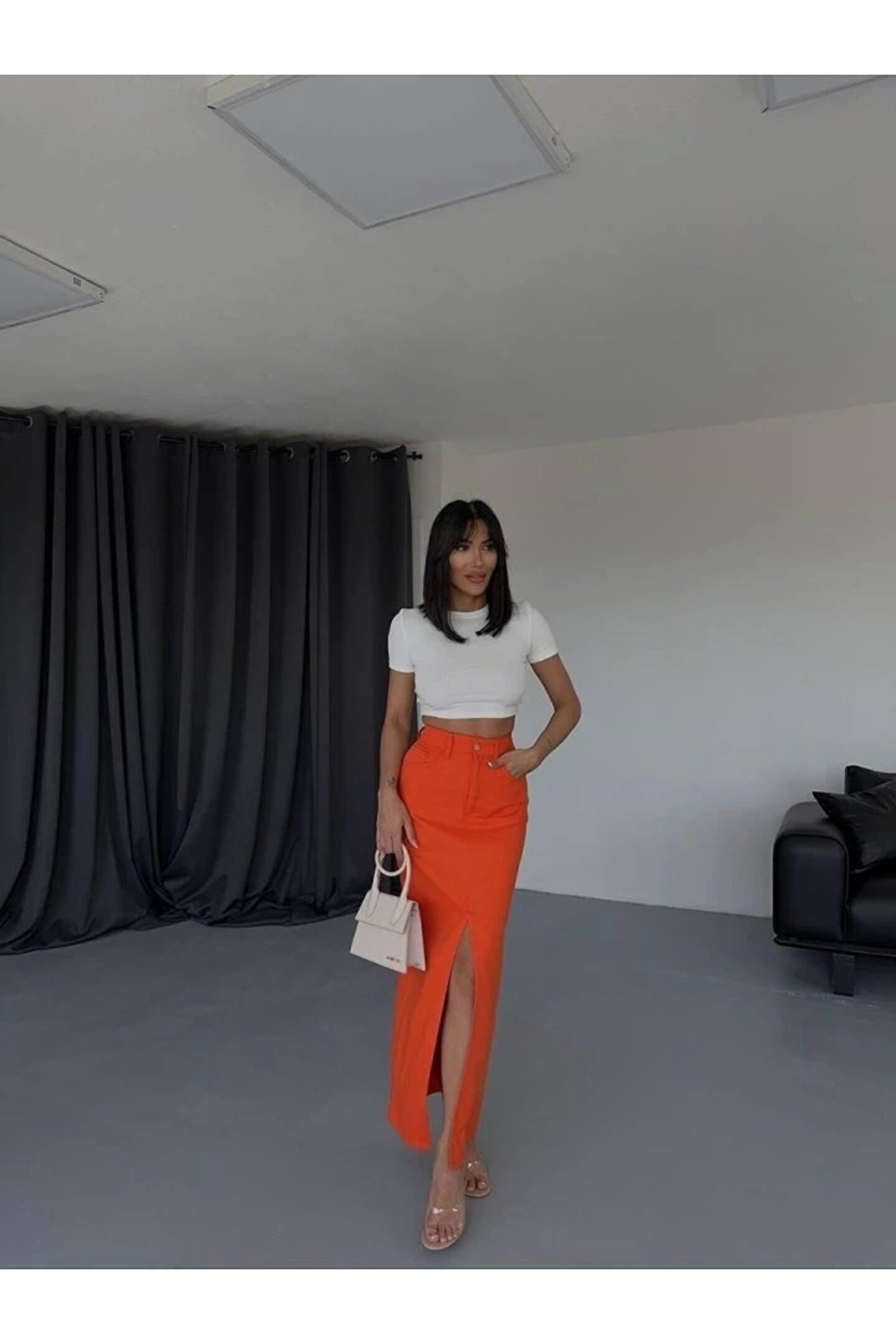 GABARDİN UZUN ÖNDEN YIRTMAÇLI ETEK - Turuncu