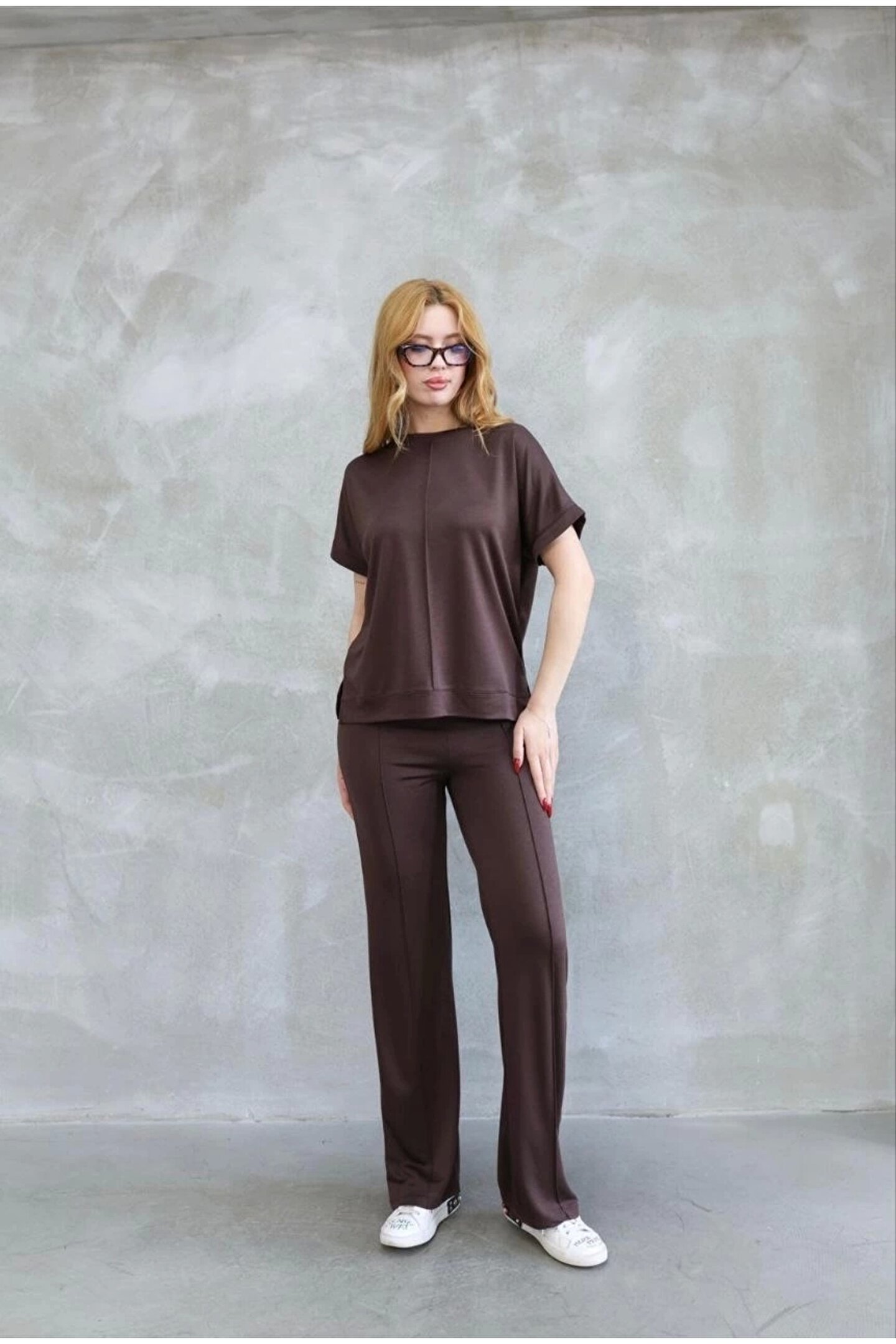 Osy Modal Yumuşak dokulu Kumaş Bisiklet Yaka Kısa Kollu Takım - Kahverengi