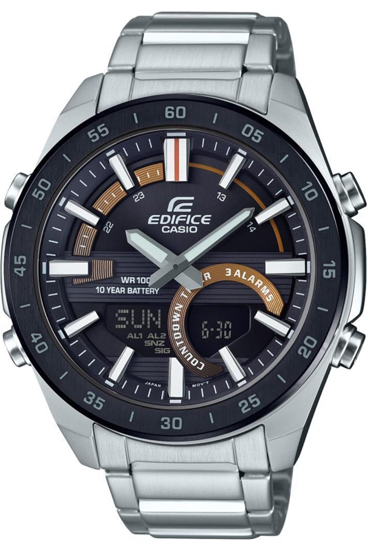 Temel Özellikler; Alarm, Dünya Saatleri, Kronometre, Takvim Genel Özellikler; Tarz : Spor&Klasik Saat Seri : Edifice Kasa Şekli : Oval Kasa Cinsi : Çelik Kasa Rengi : Gri-Siyah Kadran Rengi : Siyah Kordon Rengi : Gri Kordon Tipi : Çelik Cam Tipi : Mineral Su Geçirmezlik : 100 Atm Ağırlık : 170 Gr Ölçü : 46.9x51.5x14.2 Makine Tipi : Analog / Digital Menşei : Çin Diğer Özellikler; Tek Basmalı 3 Katlamalı Klips, 10 Yıl Pil Ömrü, 12/24 Saat Formatı, 30 Telefon Hafızası