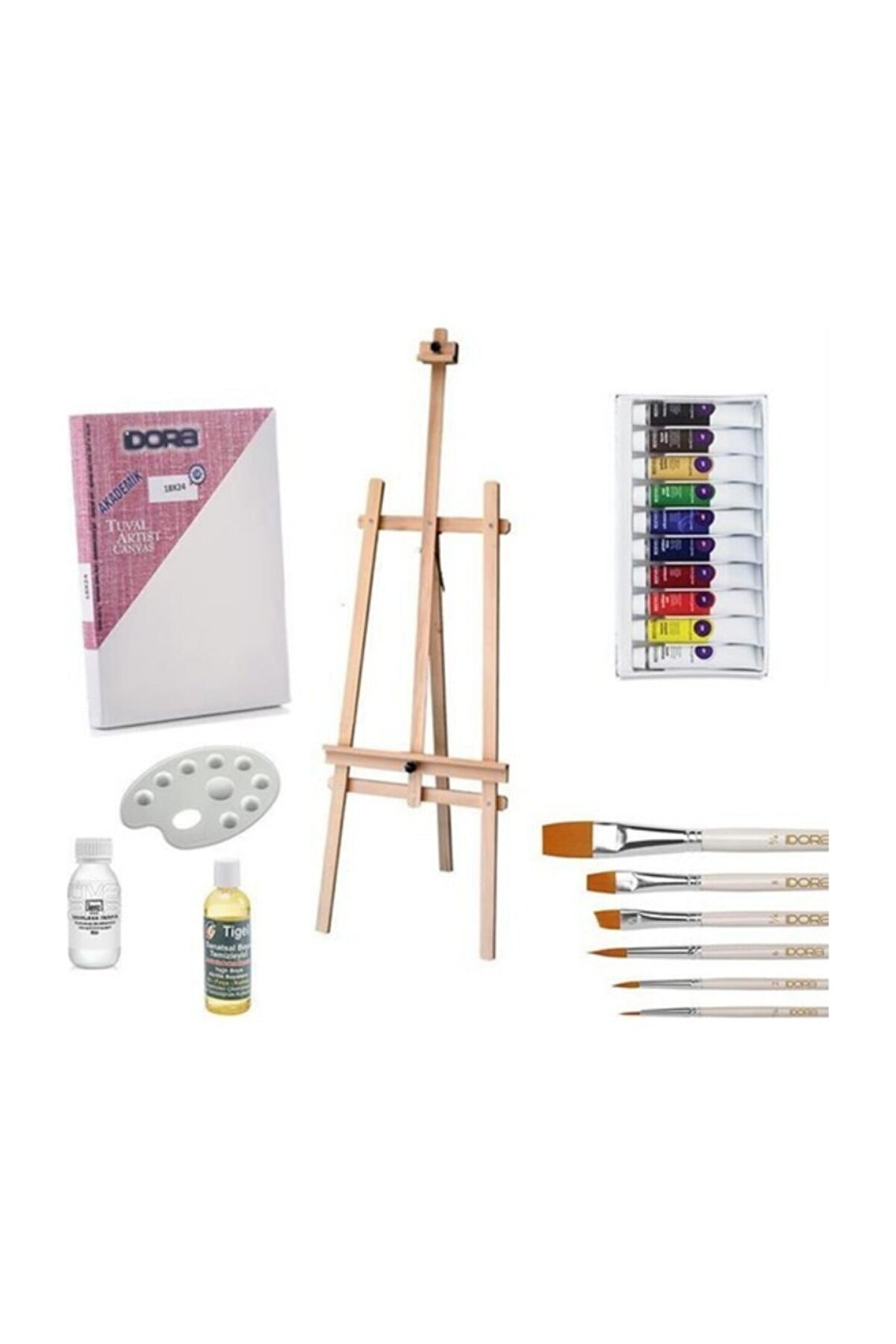 Akrilik boya başlangıç seti 175cm ahşap şövale set içeriği: 1 adet 3 ayaklı şövale 12li akrilik boya takımı 6 adet akrilik boya fırçası 35x50 tuval; Plastik palet Fırça temizleyici 100 ml; Resim yağı 100ml; ;