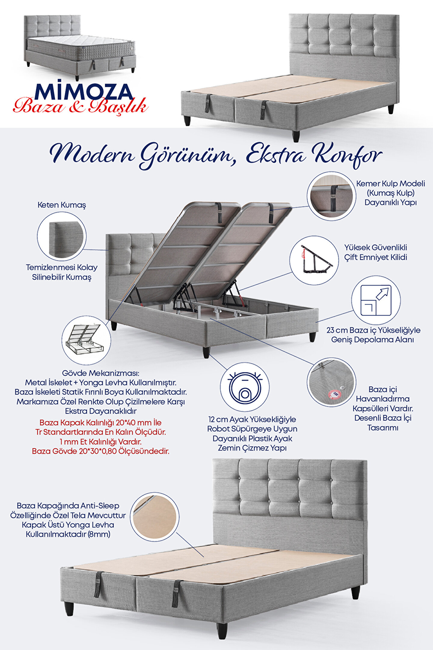 Çift Kişilik Mimoza Başlık & Baza Takımı & Yatak 3 lü Set Mimoza Başlık Özellikleri Kumaş ve Konfor Kumaş Türü: Keten kumaş Özellik: Sünger dolgulu ve kolay silinebilir yapı Ölçüler Yükseklik (Boy): 101 cm Derinlik: 7 cm Mimoza Baza Özellikleri Kumaş ve Malzeme Kumaş Türü: Keten kumaş Çevresi: Sünger dolgulu, kolay silinebilir yüzey Kapak Kalınlığı: 20x40 mm (TR standartlarında en kalın ölçü) Kapak Üstü : Kaydırmaz Tela Kullanılmıştır Et Kalınlığı: 1 mm Gövde Ölçüsü: 20x30x0.80 mm İskelet: Statik fırınlı boya, çizilmeye karşı ekstra dayanıklı ve markaya özel renkte Teknik Detaylar Baza Tipi: Sandıklı baza Depolama Alanı: 23 cm iç yükseklik Kulp Tipi: Kemer model kumaş kulp Ayak Yüksekliği: 12 cm (robot süpürge uyumlu) Gövde Mekanizması: Metal iskelet + yonga levha Güvenlik ve Dayanıklılık Emniyet: Yüksek güvenlikli emniyet kilidi Kapakta: Anti-Sleep özellikli özel tela Garanti: 2 yıl Mimoza Yatak Özellikleri Yay Sistemi Yay Yapısı: Esnek destek sağlayan Duracoil Pocket yay (Torba Yay) teknolojisi Uyum: Çift bölgeli konfor katmanı ile kişiye özel destek Destek Katmanı Konfor Süngeri: 24 DNS yüksek yoğunluklu sünger tabaka Kumaş ve Hijyen Dış Kumaş: Nefes alan, antibaktariyel dayanıklı örme kumaş Yatak Kalınlığı Yükseklik: 30 cm ideal yatak yüksekliği Ekstra Detaylar Özellik: Ters-yüz kullanılabilir yapı Paketleme : Roll Pack şeklinde gönderilmektedir.; Yatağın tam formuna gelmesi 48 - 72 saat arasındadır Nakliye bina önü değil, kapı teslimidir.