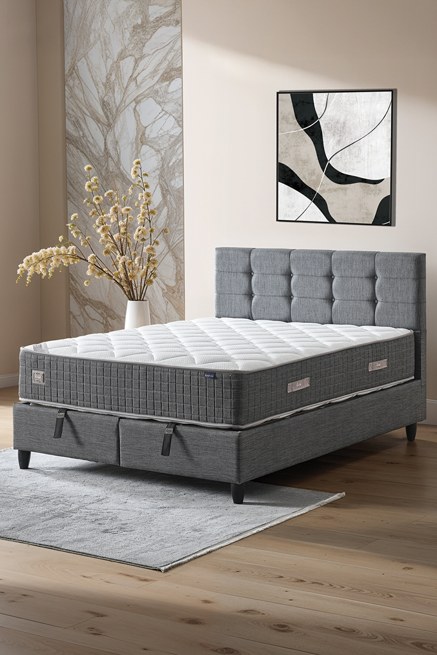 CENNET YATAK Mimoza Modeli Çift Kişilik Full Ortopedik Yataklı Sandıklı Baza ve Başlık Takımı 3 lü Set