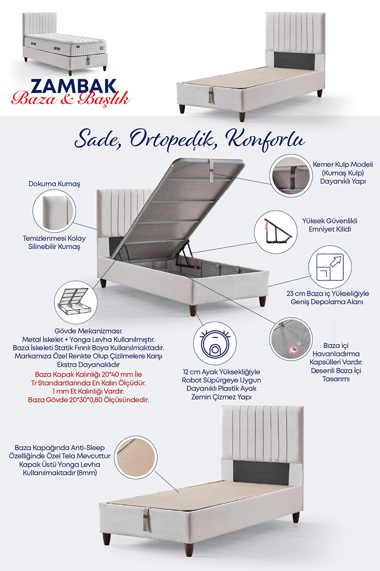 Tek Kişilik Zambak Başlık & Baza Takımı & Yatak 3 lü Set Zambak Başlık Özellikleri Kumaş ve Konfor Kumaş Türü: Dokuma kumaş Özellik: Sünger dolgulu ve kolay silinebilir yapı Ölçüler Yükseklik (Boy): 101 cm Derinlik: 7 cm Zambak Baza Özellikleri Kumaş ve Malzeme Kumaş Türü: Dokuma kumaş Çevresi: Sünger dolgulu, kolay silinebilir yüzey Kapak Kalınlığı: 20x40 mm (TR standartlarında en kalın ölçü) Kapak Üstü : Kaydırmaz Tela Kullanılmıştır Et Kalınlığı: 1 mm Gövde Ölçüsü: 20x30x0.80 mm İskelet: Statik fırınlı boya, çizilmeye karşı ekstra dayanıklı ve markaya özel renkte Teknik Detaylar Baza Tipi: Sandıklı baza Depolama Alanı: 23 cm iç yükseklik Kulp Tipi: Kemer model kumaş kulp Ayak Yüksekliği: 12 cm (robot süpürge uyumlu) Gövde Mekanizması: Metal iskelet + yonga levha Güvenlik ve Dayanıklılık Emniyet: Yüksek güvenlikli emniyet kilidi Kapakta: Anti-Sleep özellikli özel tela Garanti: 2 yıl Zambak Yatak Özellikleri Yay Tipi - Ortopedik Paket Yay Sistemi Yay: 5 Zone' lu Paket yay sistemi ile her bir yay bağımsız çalışır, vücut hatlarına mükemmel uyum sağlar.; Faydası: Vücut kıvrımlarını destekleyerek doğru omurga desteği sağlar ve uyku esnasında rahatlık sunar.; Sünger Tipi Sünger: 24 DNS ortopedik sünger, ekstra konfor ve destek sağlar.; Kumaş Türü Kumaş: Örme kumaş, antibakteriyel kumaş seçenekleriyle sağlıklı uyku.; Yatak Yüksekliği Toplam Yükseklik: 30 cm (modele göre değişebilir) Ekstra Özellikler Kullanım: Tek taraflı, uzun ömürlü kullanım avantajı Ped: Kendinden sabit Pedli ve ekstra konfor sağlar Paketleme : Roll Pack şeklinde gönderilmektedir.; Yatağın tam formuna gelmesi 48 - 72 saat arasındadır Nakliye bina önü değil, kapı teslimidir.