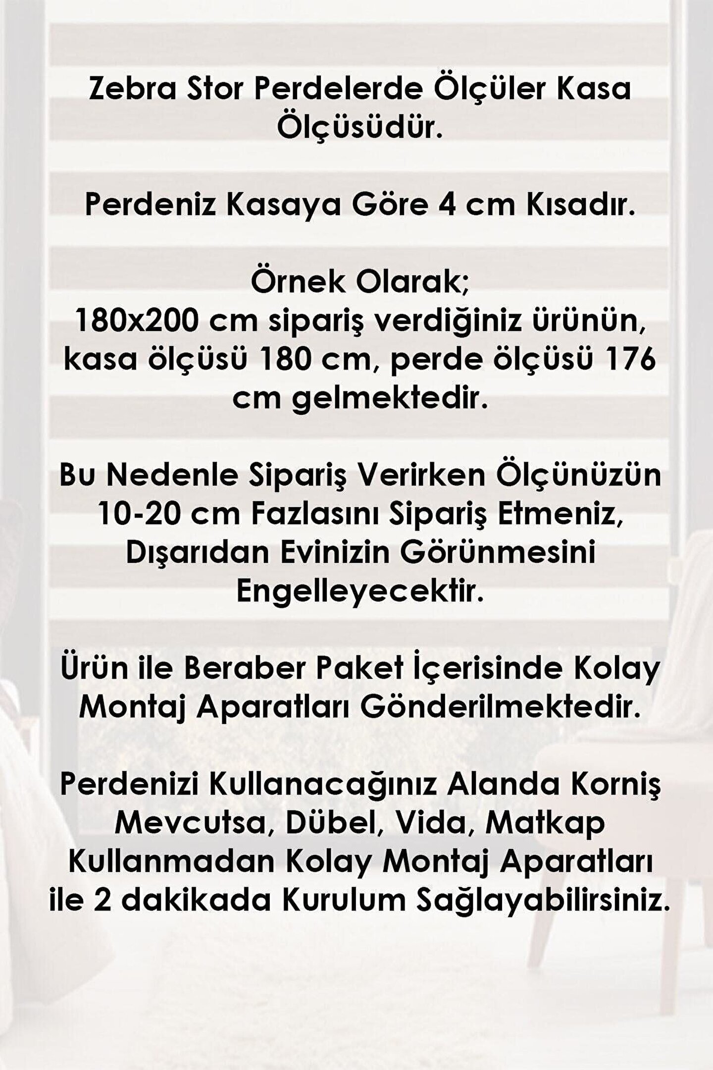 (30x30 NUMUNE ÖLÇÜSÜDÜR SADECE KUMAŞ GÖNDERİLİR) Perde ölçüsü alırken pencere genişliğinden 20cm fazla perde seçebilirsiniz. ; Mesela pencereniz 100cm ise 120X200 perdeyi seçiniz. ; Takacağınız zebra perde pencerenizin sağ ve solundan 10cm fazla olursa dışarıdan görüntüyü tamamen kapatırsınız. ; Seçeceğiniz ölçüler En ve Boy şeklindedir. ; Örnek olarak 120X200 seçtiğinizde 120cm eninde, 200cm yüksekliğinde zebra perde gönderilmektedir. ; 120cm eni kasa genişliğidir. ; Perde kasadan 4cm daha kısadır. ; Yani 120cm lik perde aldığınızda 116cm genişliğinde perde almış olursunuz. ; Perde tam açıldığında 2mt yüksekliğinde camı kapatmaktadır. ; Camın yüksekliği daha az ise de camı kapatacak kadar açmanız yeterlidir. ; Ara ölçülerinizde bir üst ölçüyü tercih ediniz, daha sonra istediğiniz ölçü için bizimle iletişimize geçiniz.;