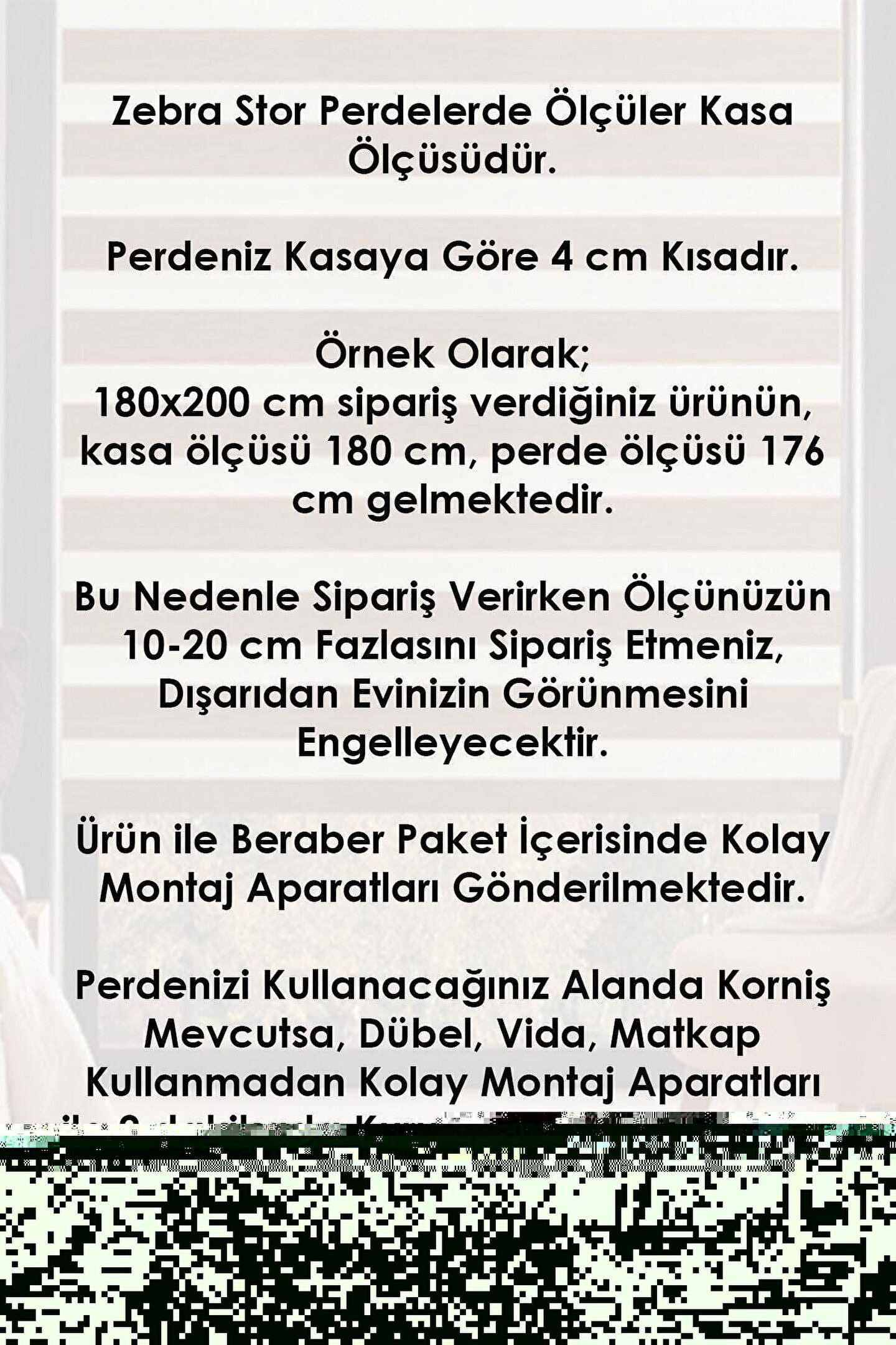 Ürünün kutusundan kolay tavan ve kroniş montaj parçaları çıkmaktadır ; Duvar montajı için L parça yoktur Perde ölçüsü alırken pencere genişliğinden 20cm fazla perde seçebilirsiniz ; Mesela pencereniz 100cm ise 120X200 perdeyi seçiniz ; Takacağınız zebra perde pencerenizin sağ ve solundan 10cm fazla olursa dışarıdan görüntüyü tamamen kapatırsınız ; Seçeceğiniz ölçüler En ve Boy şeklindedir ; Örnek olarak 120X200 seçtiğinizde 120cm eninde, 200cm yüksekliğinde zebra perde gönderilmektedir ; 120cm eni kasa genişliğidir ; Perde kasadan 4cm daha kısadır ; Yani 120cm lik perde aldığınızda 116cm genişliğinde perde almış olursunuz ; Pencereniz 100cm genişliğinde ise kenarlardan 8'er cm civarında perde duvarı kapatır ; Perde tam açıldığında 2mt yüksekliğinde camı kapatmaktadır ; Camın yüksekliği daha az ise de camı kapatacak kadar açmanız yeterlidir ; Örnek ölçüm aşağıdaki şekilde olmalıdır ; Zebra perdelerimizin alt etek dilimi yüksekliği 25cm dir ; Aldığınız üründe alt etek dilimi varsa ölçüye bunu da dahil ediniz ; Eğer kanatlı açılır pencereye takacaksanız perdeyi tamamen kaldırdığınızda alt etek dilimi kapanmayacağı için pencerenizin açılmasına engel olabilir veya pencere açıldığında alt etek dilimine zarar verebilir ; Lütfen buna dikkat ediniz ; Ürünlerimiz size gönderilmeden önce üretim aşamasında tüm testlerden geçirilmektedir ; Sorunsuz ve eksiksiz olarak gönderilmektedir ; Zebra perde, duvara ve kornişe montaj aparatlları kutudan çıkmaktadır ; Tüm zebra perdelerimizde kullanılan malzeme ve kumaşlar OEKO-TEX® Standard 100 sertifikasına sahiptir ; Uzun yıllar dayanan kalın ve kaliteli kumaştan üretilmiştir ; Hiçbir zararlı veya kanserojen kimyasal içermez ; Koku ve leke tutmaz ; Kolay silinir ve temizlenir ; Nemli ve yumuşak bir bezle kolayca silebilirsiniz ; Lütfen makinada yıkamayınız ve kurutma makinasında kurutmayınız zebra perde ile evinizin ve odanızın şıklığı ortaya çıkacaktır ; Uzun yıllar kullanabilirsiniz ; Mikro petekli kumaş dokusu yıllarca bozulmadan ve özelliğini yütürmeden odanızı süsler ; Hem güneşlik hem tül perde özelliği ile tek perde ile bir görüntü oluşturur