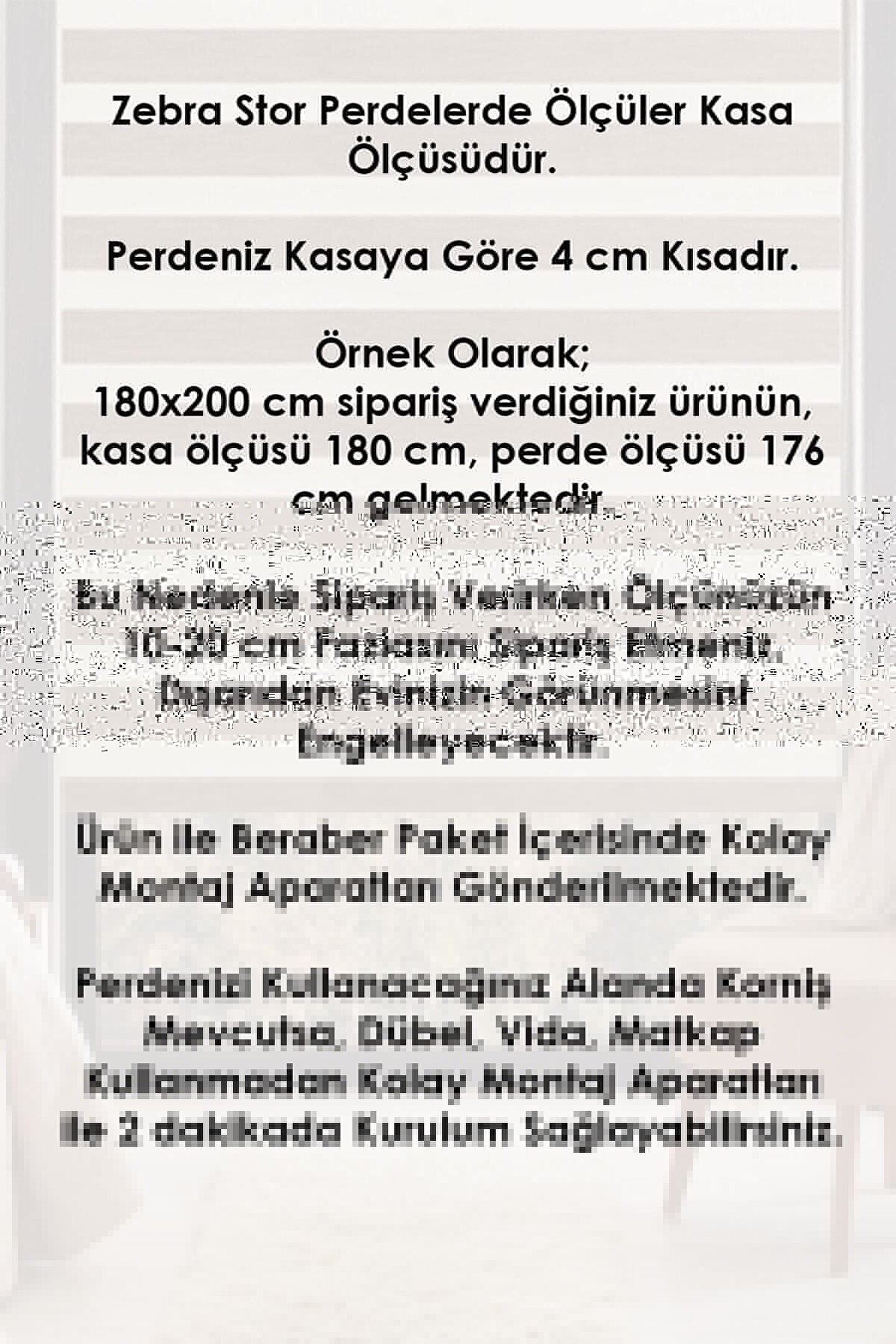 (30x30 NUMUNE ÖLÇÜSÜDÜR SADECE KUMAŞ GÖNDERİLİR) Perde ölçüsü alırken pencere genişliğinden 20cm fazla perde seçebilirsiniz. ; Mesela pencereniz 100cm ise 120X200 perdeyi seçiniz. ; Takacağınız zebra perde pencerenizin sağ ve solundan 10cm fazla olursa dışarıdan görüntüyü tamamen kapatırsınız. ; Seçeceğiniz ölçüler En ve Boy şeklindedir. ; Örnek olarak 120X200 seçtiğinizde 120cm eninde, 200cm yüksekliğinde zebra perde gönderilmektedir. ; 120cm eni kasa genişliğidir. ; Perde kasadan 4cm daha kısadır. ; Yani 120cm lik perde aldığınızda 116cm genişliğinde perde almış olursunuz. ; Perde tam açıldığında 2mt yüksekliğinde camı kapatmaktadır. ; Camın yüksekliği daha az ise de camı kapatacak kadar açmanız yeterlidir. ; Ara ölçülerinizde bir üst ölçüyü tercih ediniz, daha sonra istediğiniz ölçü için bizimle iletişimize geçiniz.;