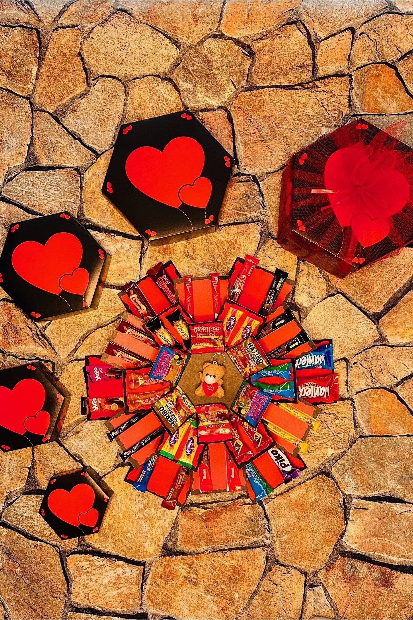 Kutu içerisinde 40 adet çikolata bulunmaktadır; Çikolataların hepsi markalı çikolatalar olup resimde göründüğü gibi gelmektedir; Kutunun kapalı hali 22; 25; 14 cm altıgen şeklindedir; ;;