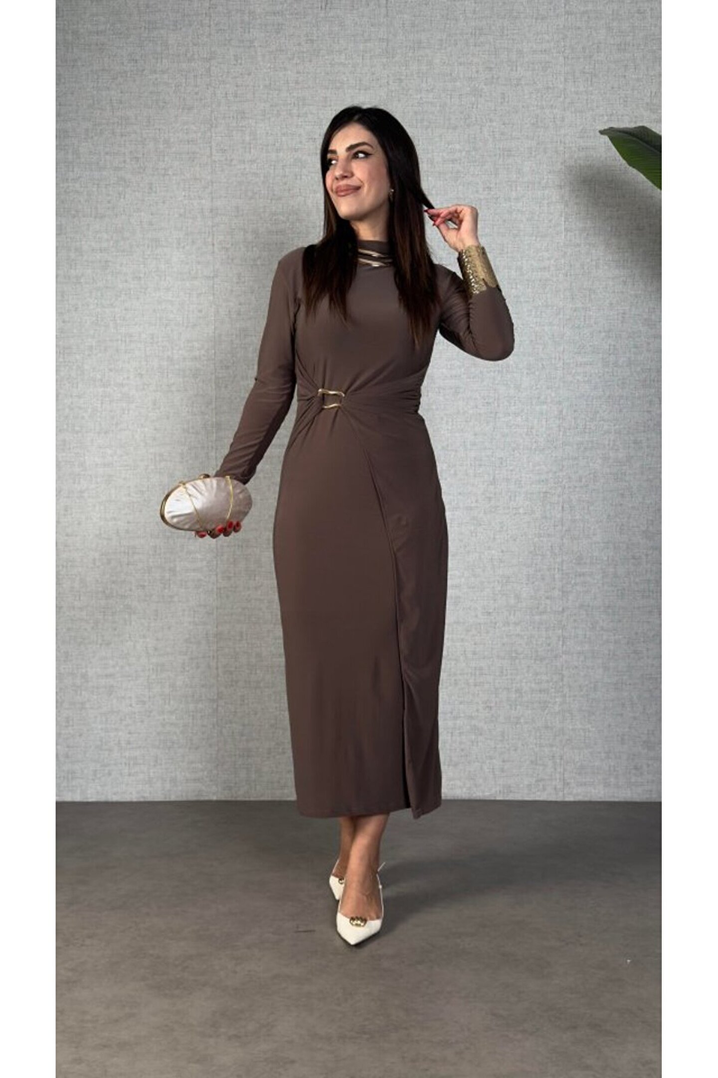 Kadın Balıkçı Yaka Toka Detay Sandy Kumaş Midi Boy Elbise