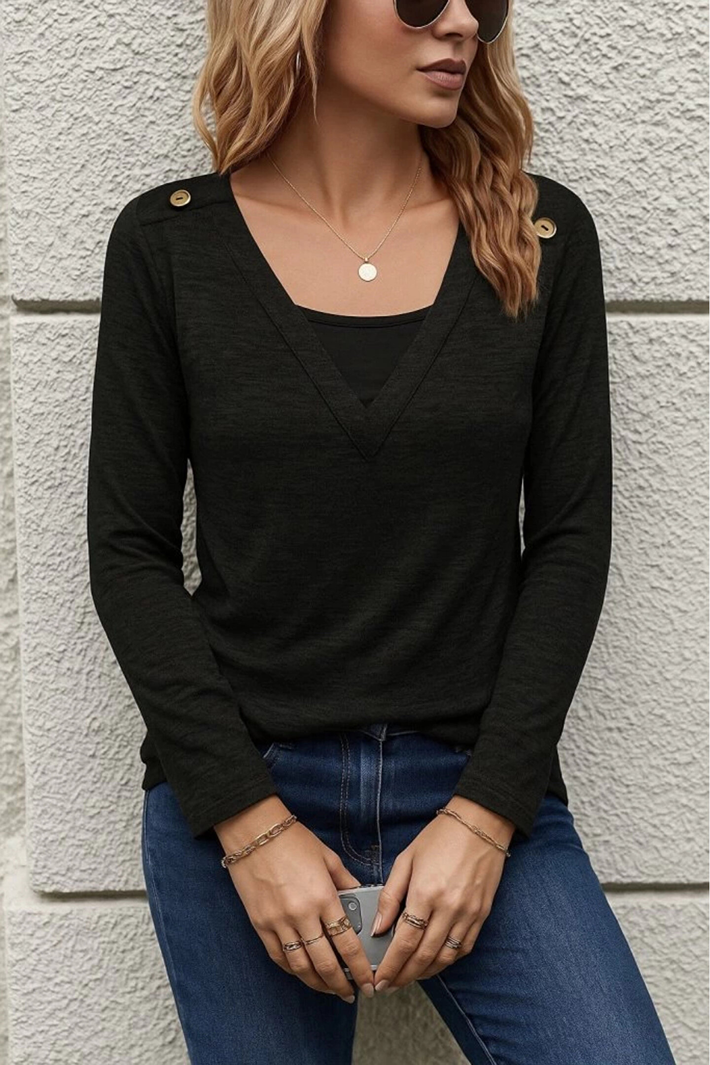 Kadın Uzun Kollu V Yaka Düğme Detaylı Yumoş Bluz