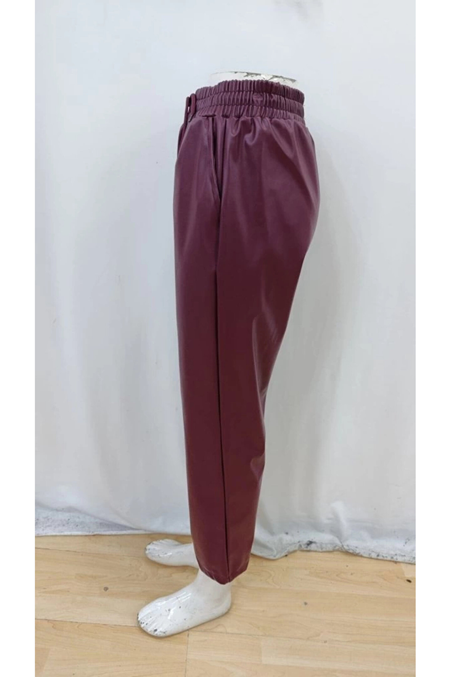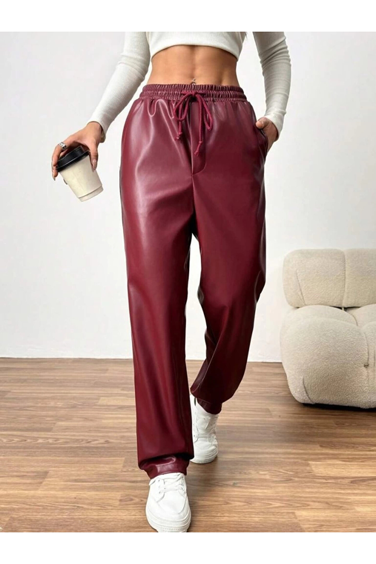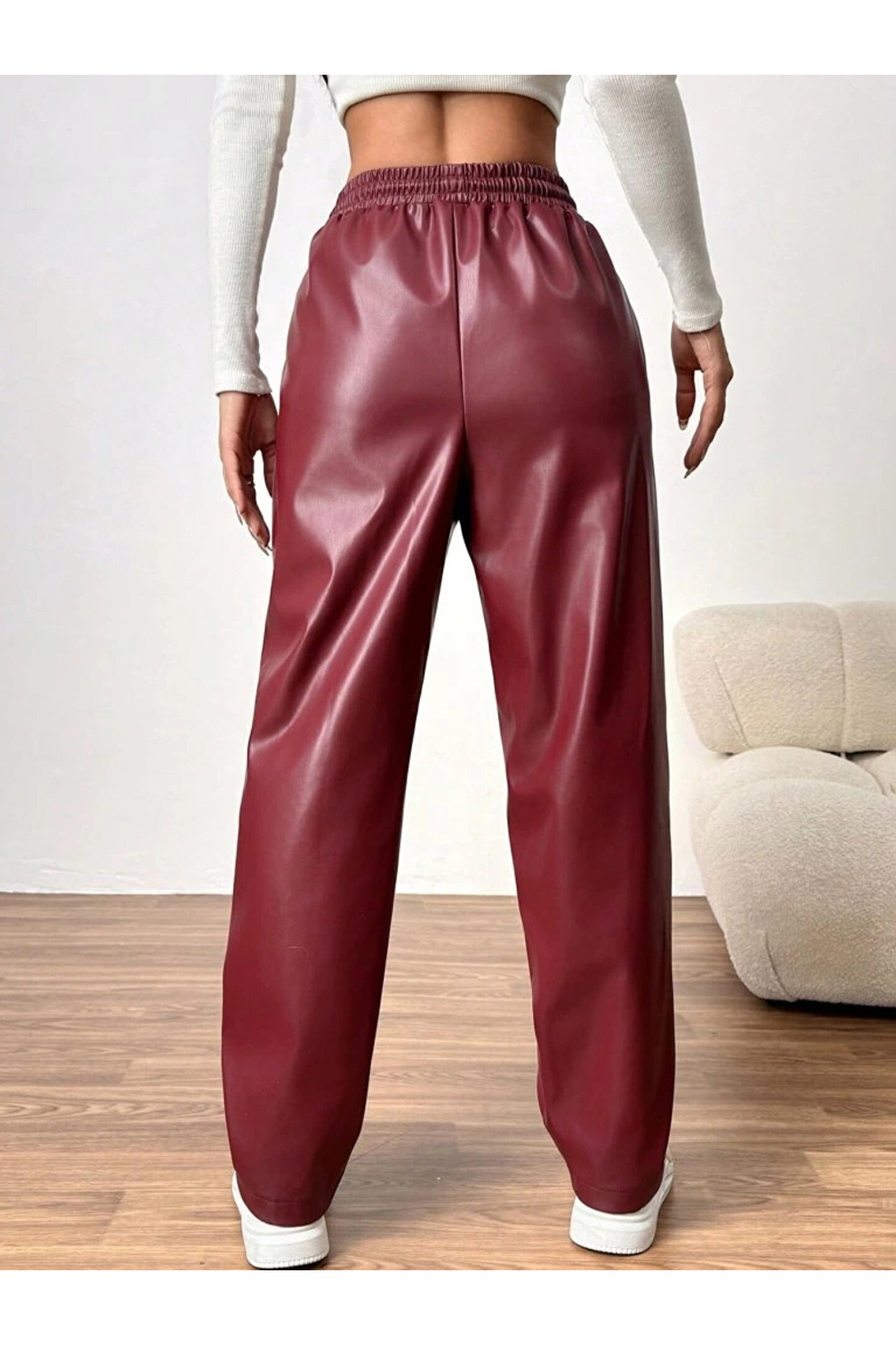 Kadın Yüksel Bel Bağcıklı Deri Pantolon