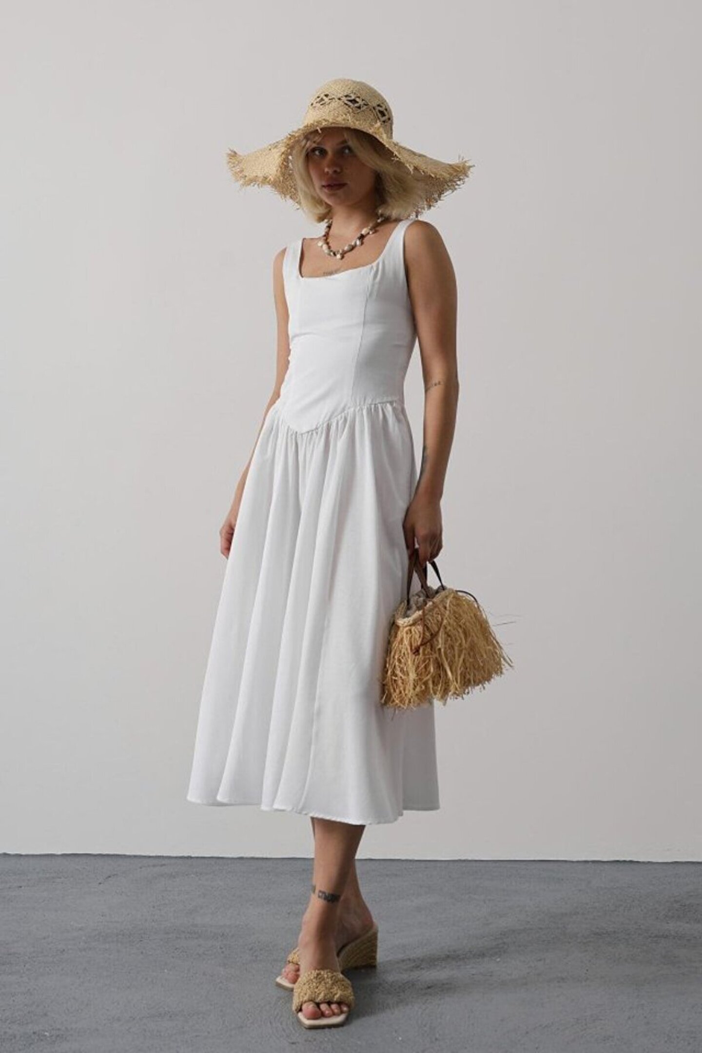 Pile Etek İnce Askılı Korse Formlu Poplin Kumaş Mavi Midi Elbise