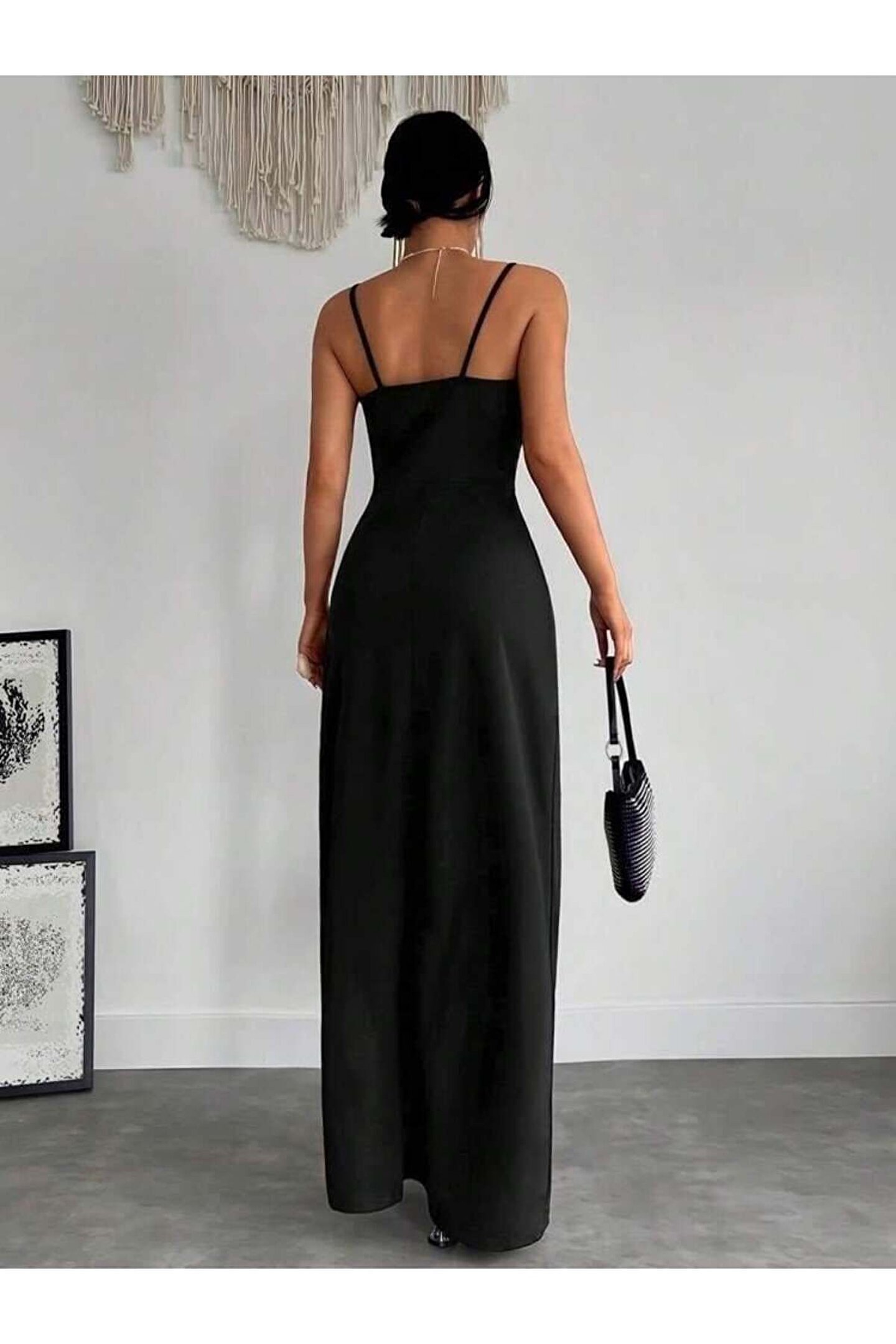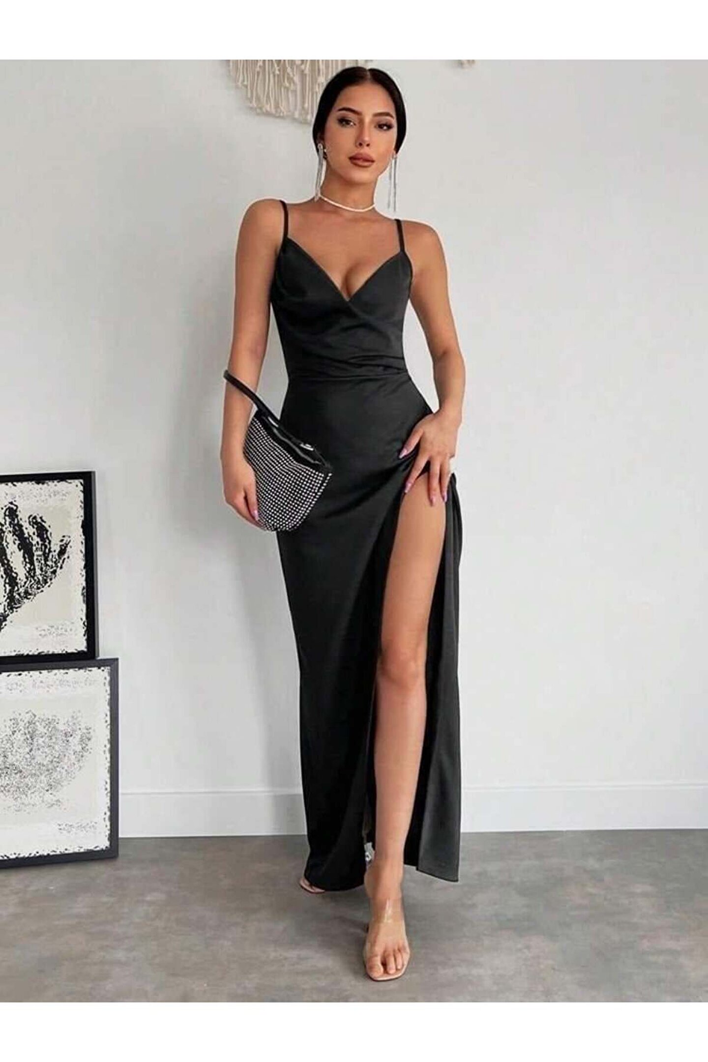 Kadın Askılı Kruvaze Yakalı Yırtmaçlı Krep Elbise
