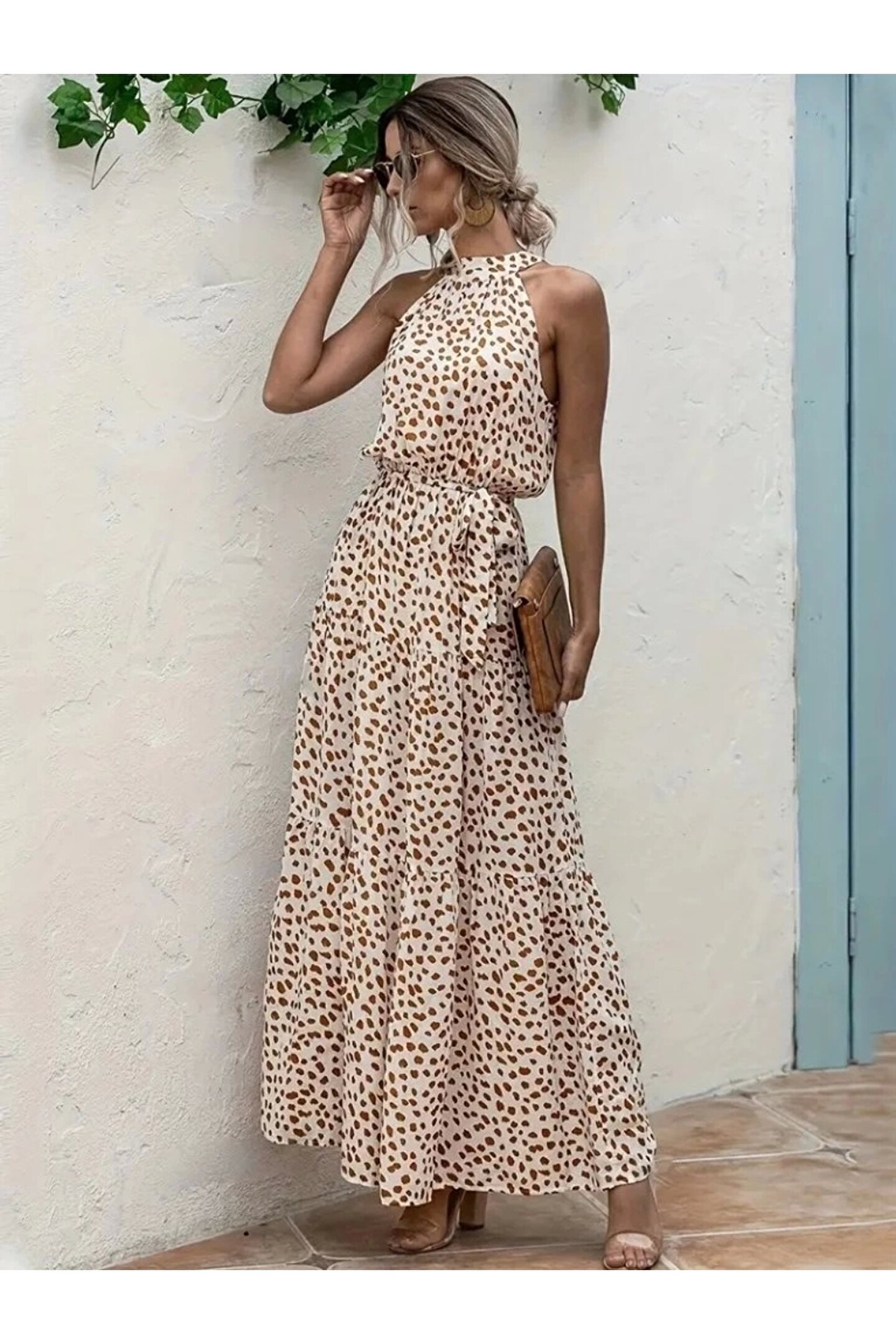 Desenli İnce Askılı Pembe Uzun Şifon Elbise