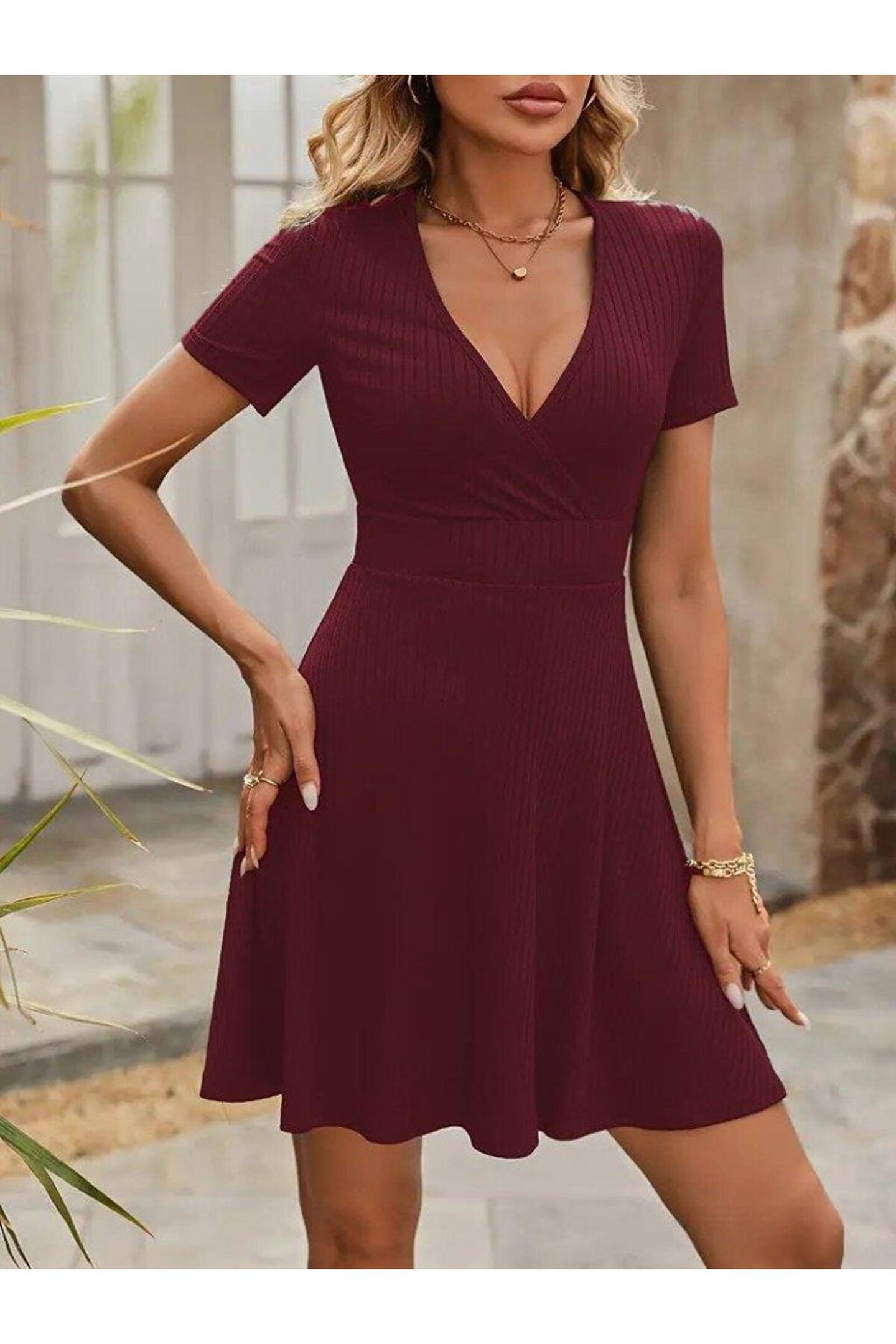 Kadın Kısa Kollu Kruvaze Yaka A Kesim Kalın Fitilli Kaşkorse Elbise