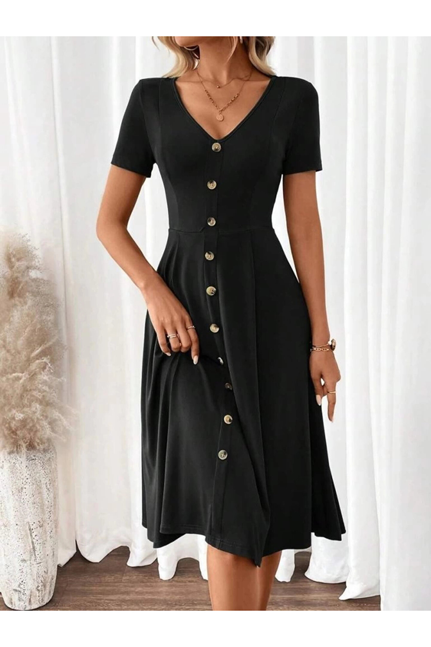 Kadın Kısa Kollu V Yakalı önden Düğmeli A Kesim Dokuma Elbise