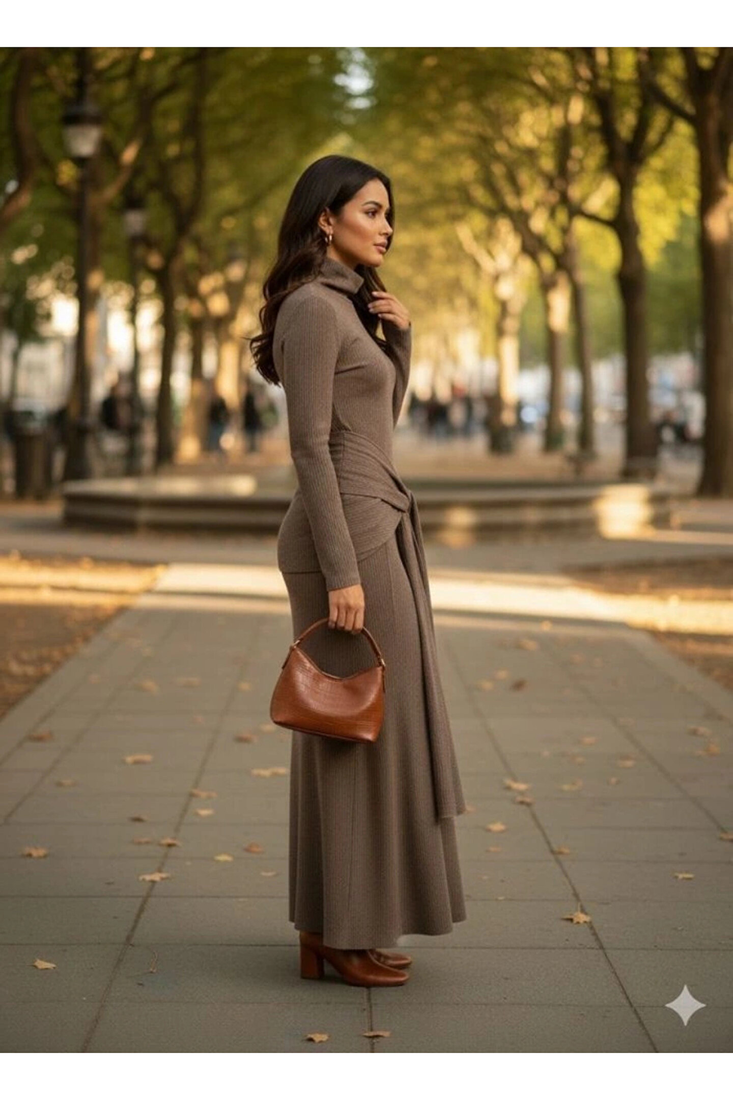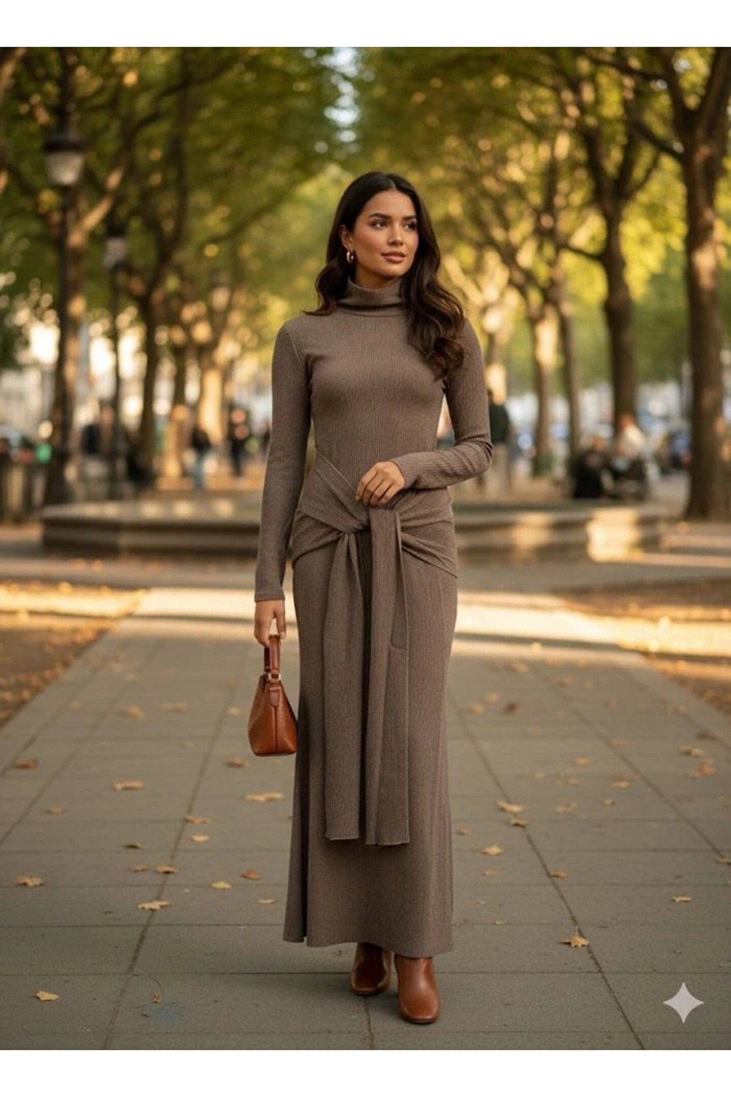 Kadın Uzun Kollu Balıkçı Yaka Bürümcük Kumaş Kuşak Dahil Kalem Elbise