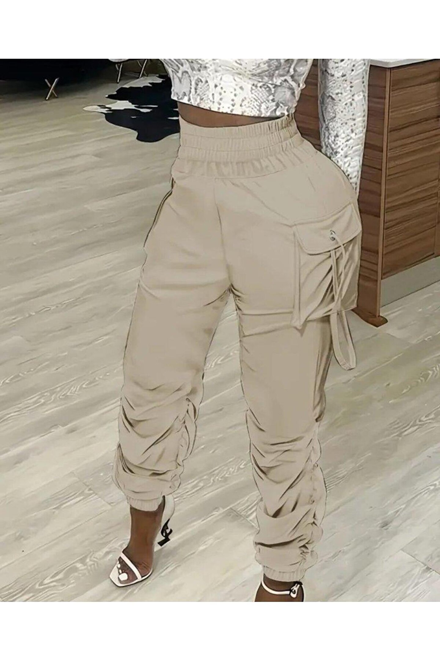 Kadın Yüksek Bel Beli Lastikli Kargo Cep Detaylı Gabardin Pantolon