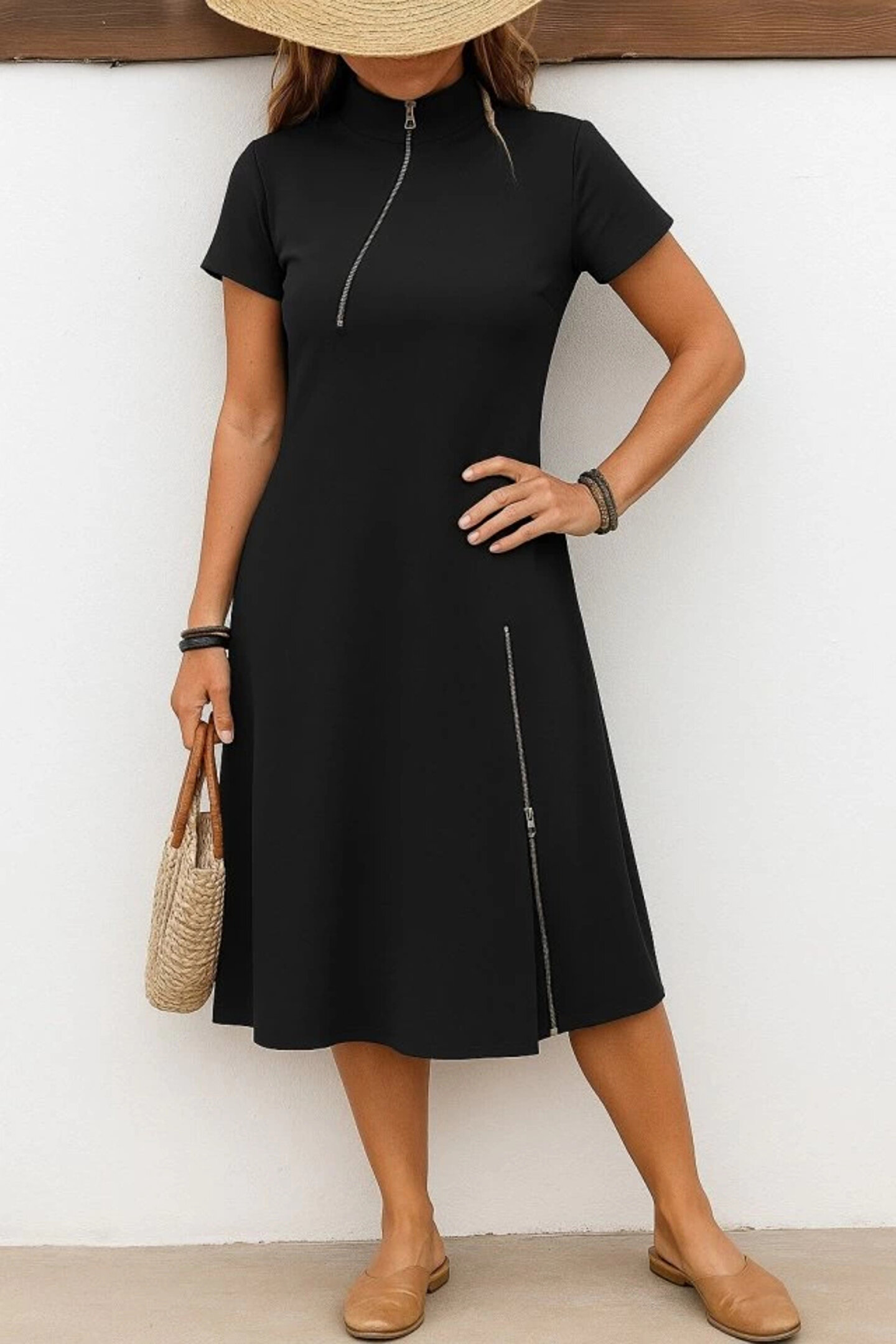 MDB Kadın Kısa Kollu Yakadan Ve Etekten Fermuarlı Midi Viskon Iki Iplik Elbise