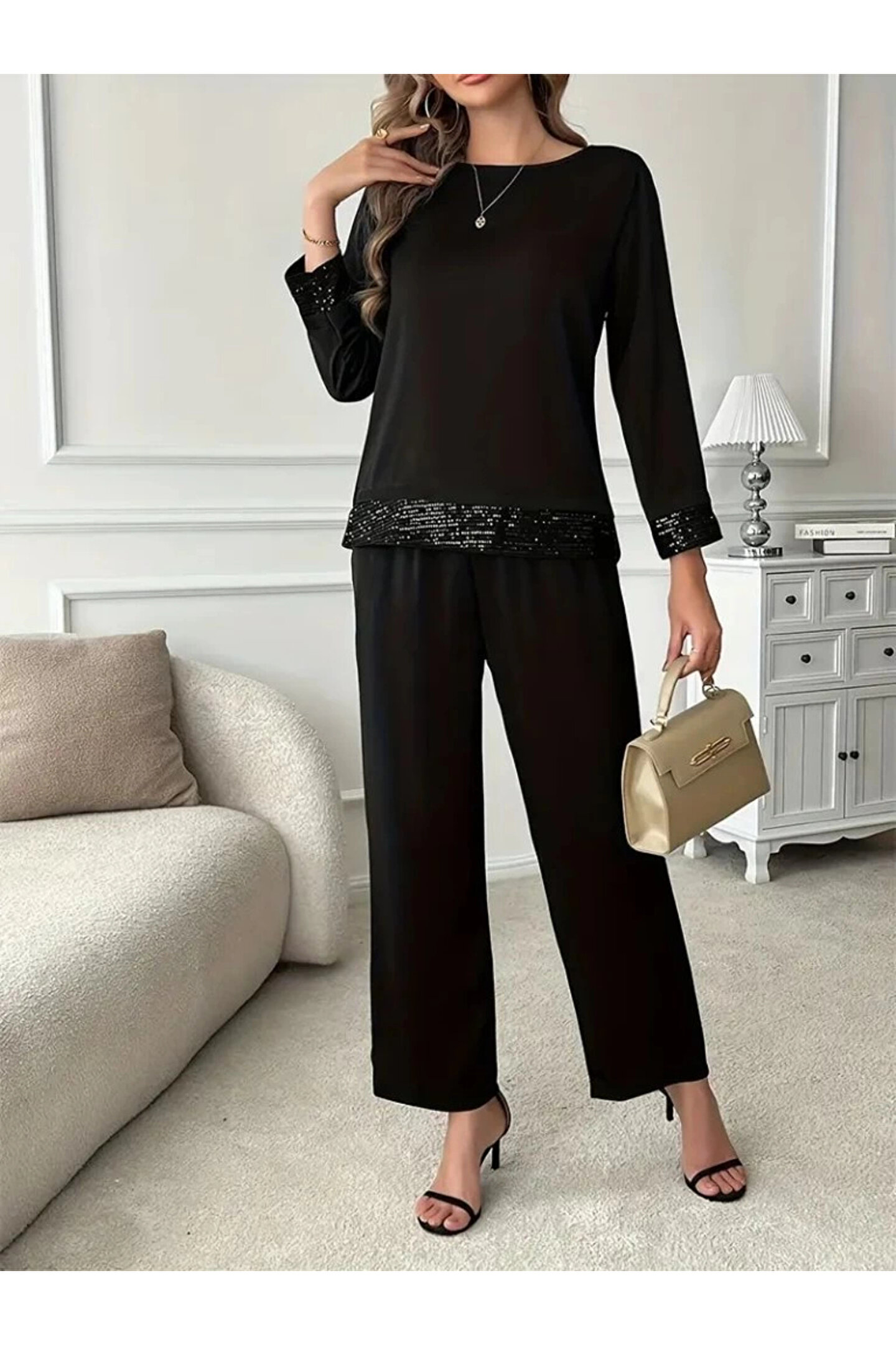 MDB Kadın Uzun Kollu Bisiklet Yaka Pulpayetli Viskon Iki Iplik Bluz Ve Pantolon Ikili Takım