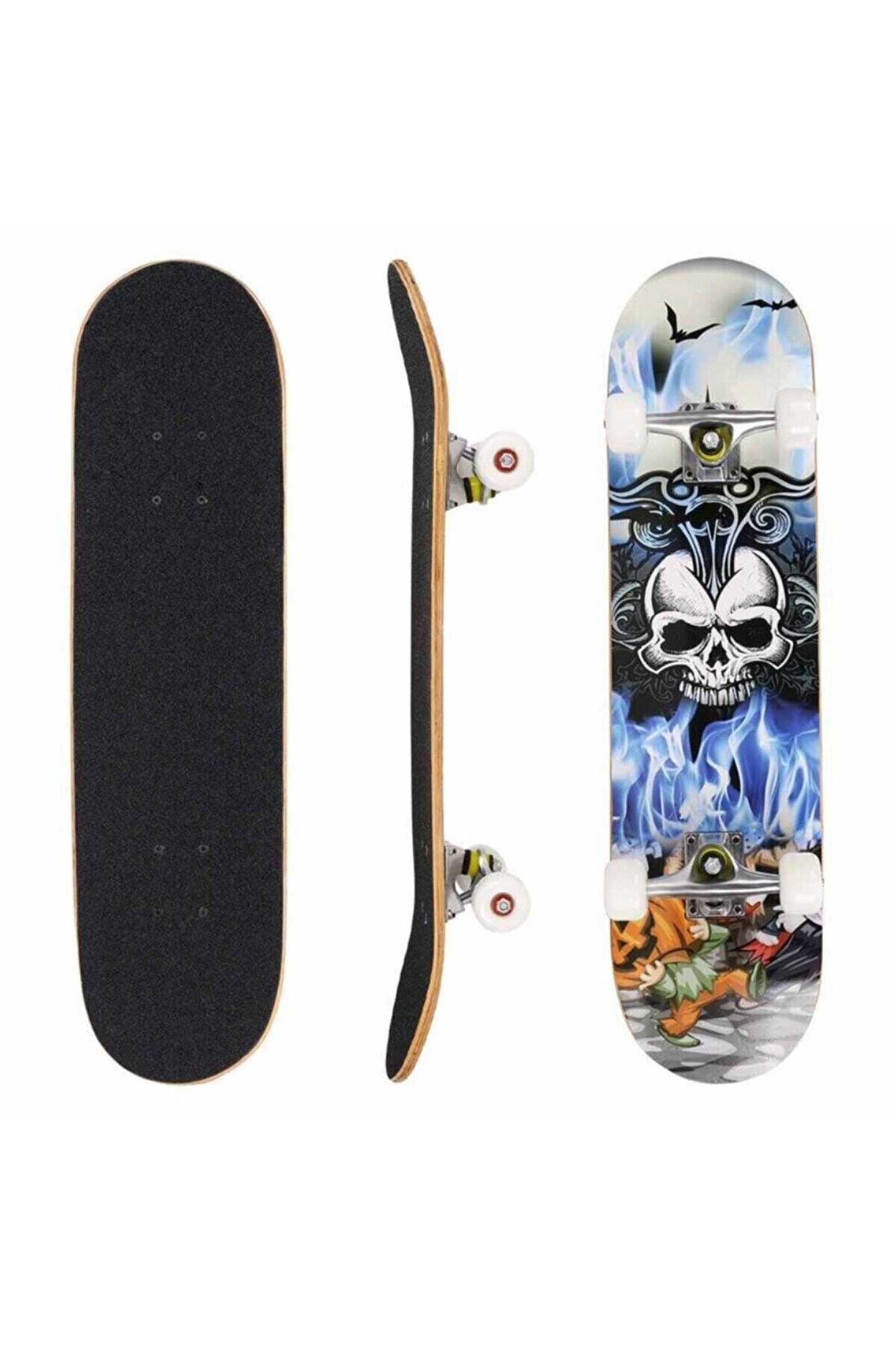 Kaykay Zımparalı Üst Yüzey Silikon Tekerli Akağaç Ahşap Kaykay Kurukafa Desenli