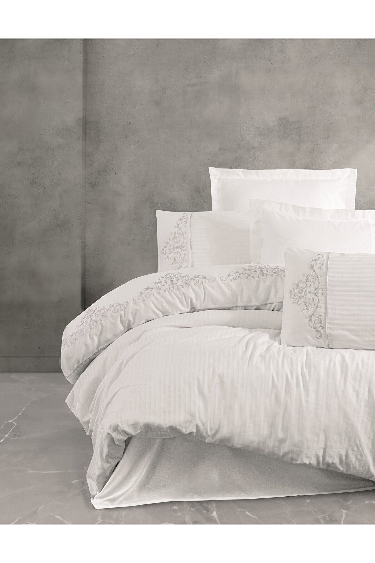 Nakışlı Saten Çift Kişilik Nevresim Takımı Genny Beyaz